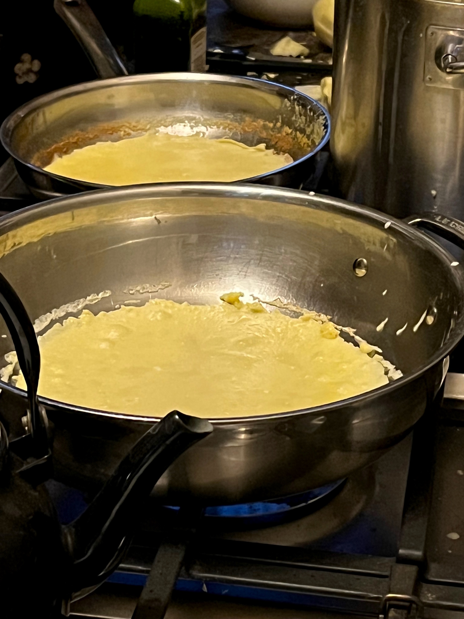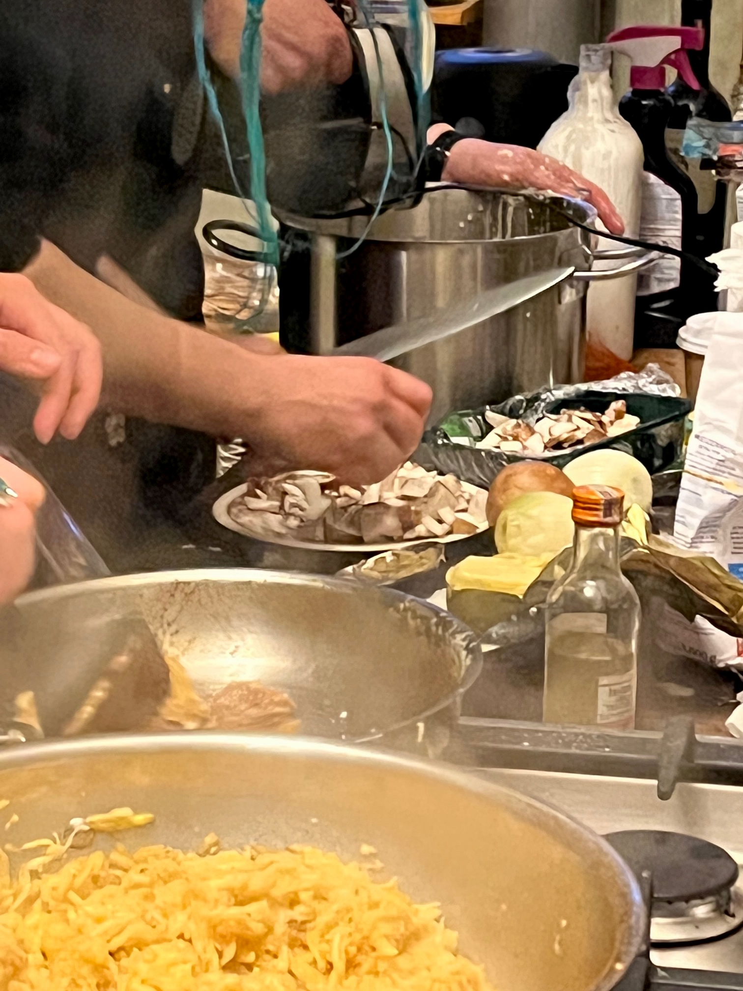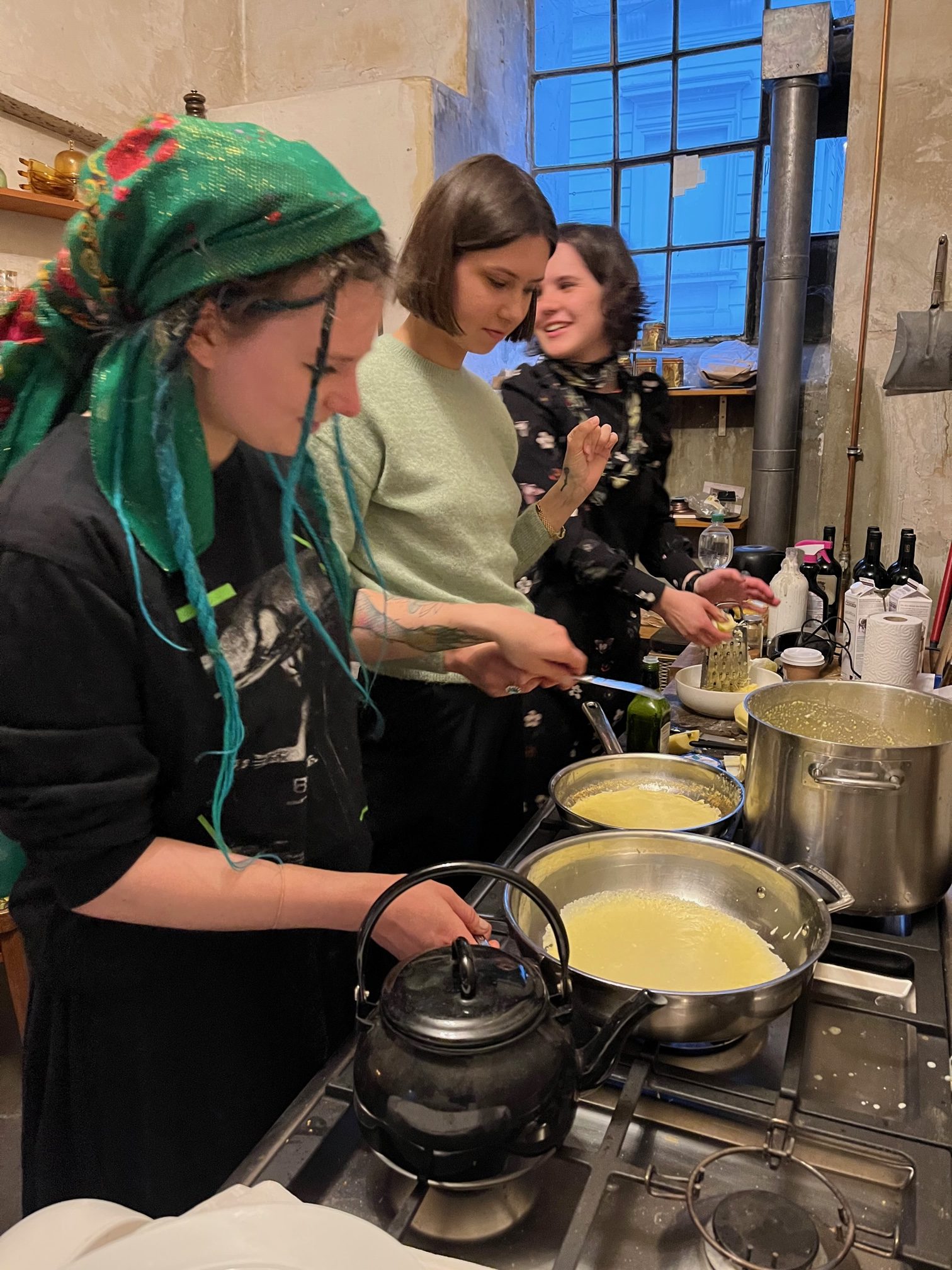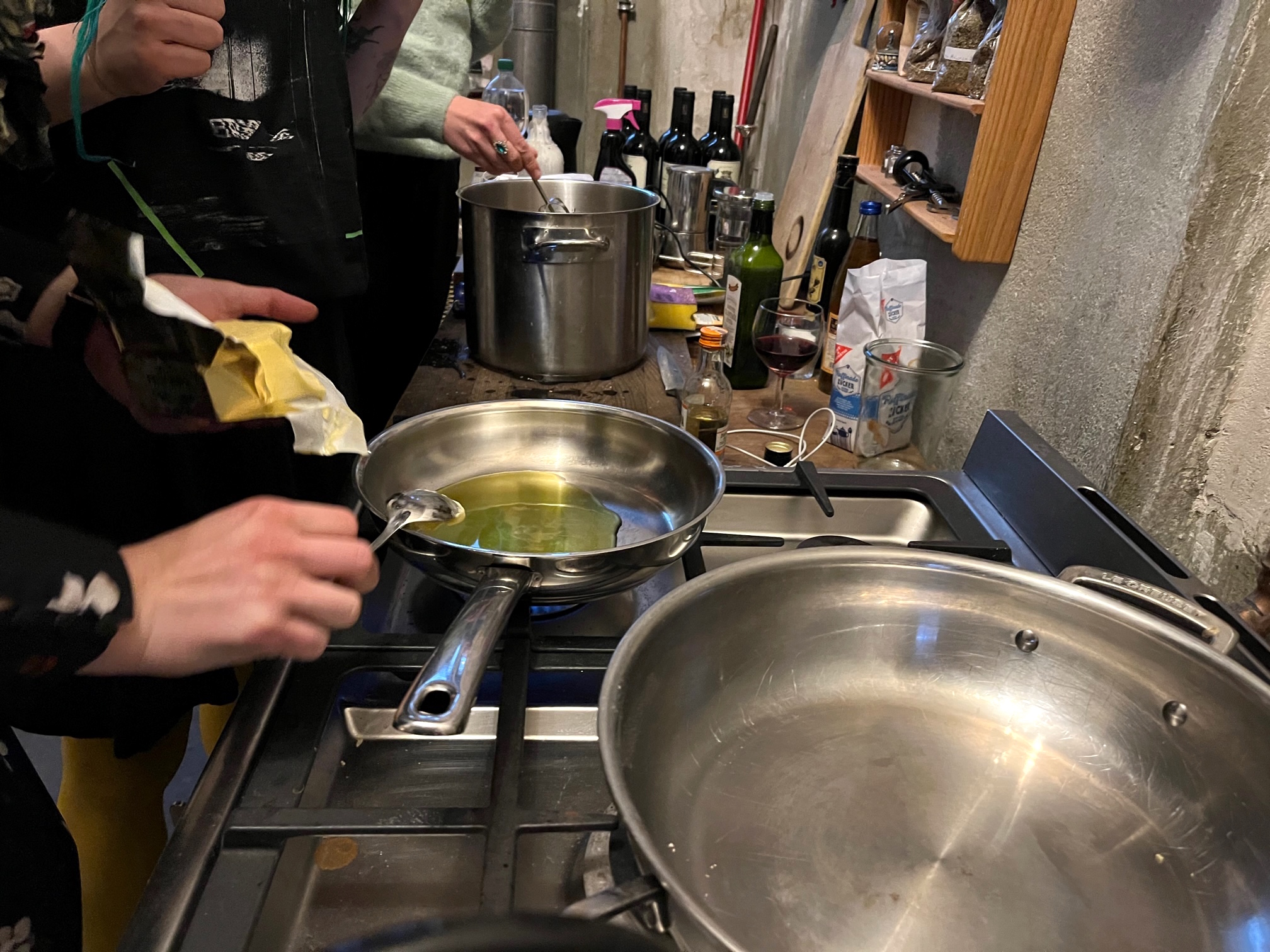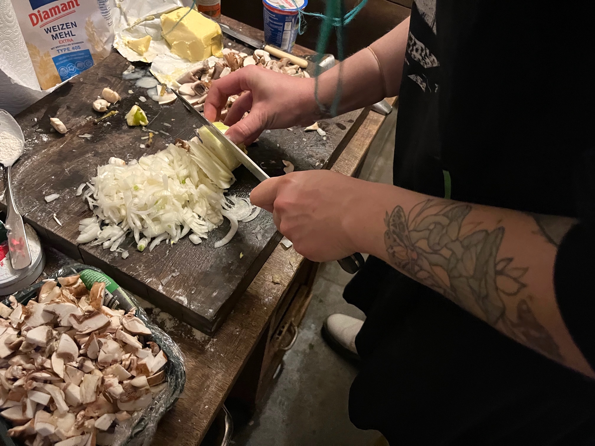 Parallel werden die anderen Füllungen zubereitet, sowohl süß wie herzfaft mit Hüttenkäse und Quark, oder Champignos mit Zwiebeln. Thomas erwähnt mehrfach, er hätte Hunger, aber die drei sind vertieft in ihre Arbeit.