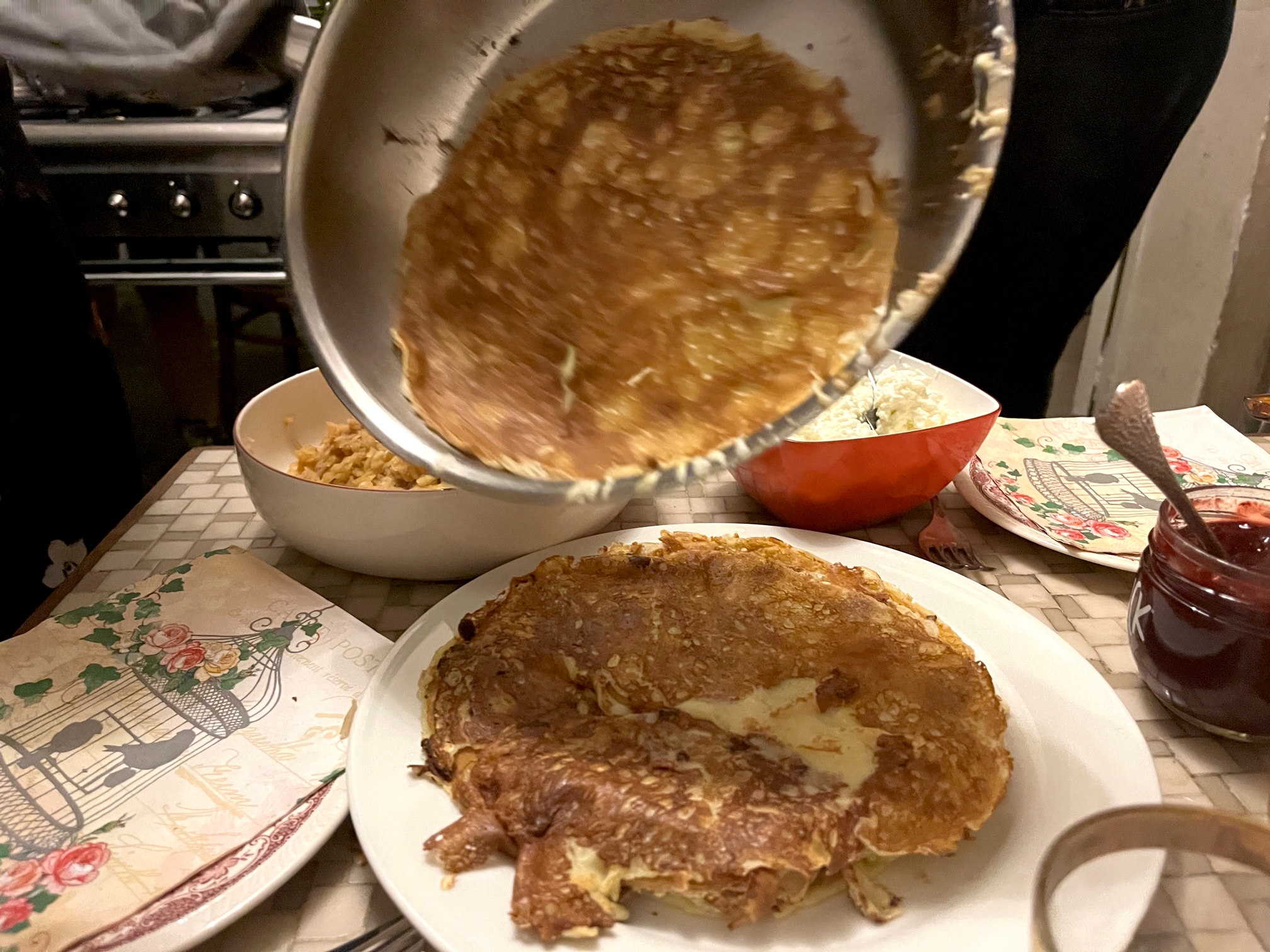 Die Pfannen sind nicht die richtigen, und so gehen die ersten Mlyntski daneben, aber dann entwickeln die drei Köchinnen eine wahre Meisterschaft. Der Stapel wächst. Es wird gelacht und gescherzt.