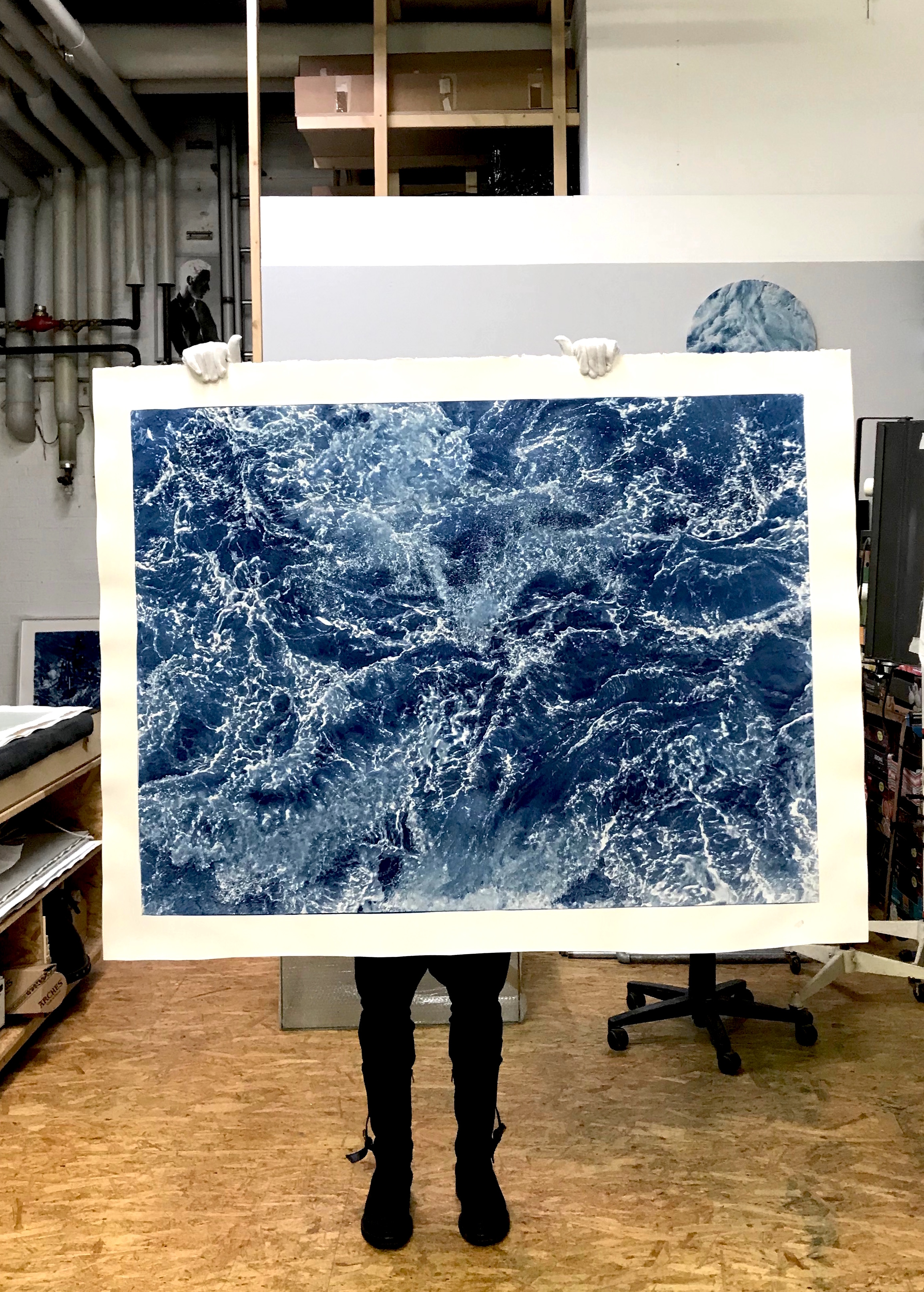 Abb.: Ulf Saupe in seinem Berliner Atelier mit der Cyanotypie “Waterscape No.24”.