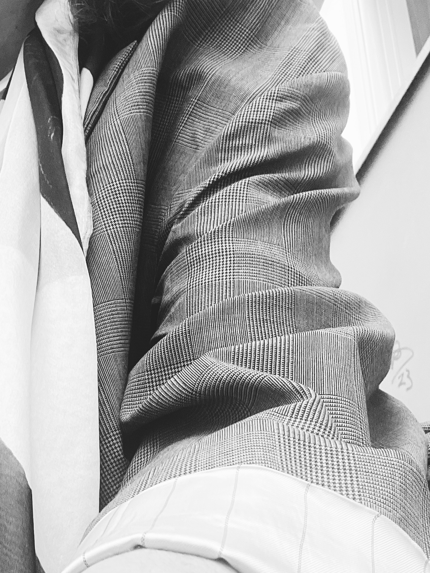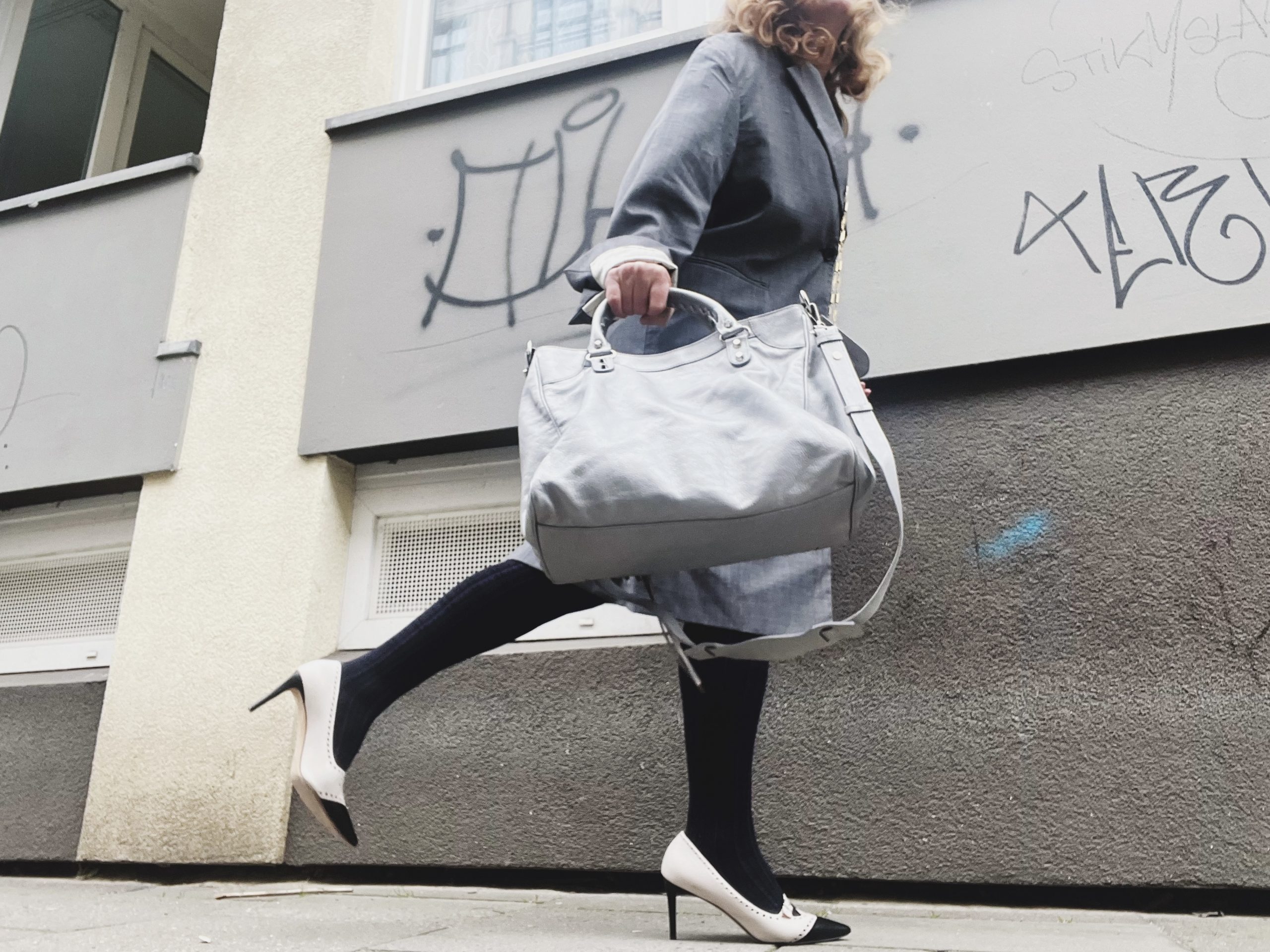 Dazu die Weglauf-Pumps von Taglia Scarpe. Und was trage ich dadrunter? Es blieb keine Zeit für viel. Die Strumpfhose von Wolford und die neue weiße Kimono-Bluse. Bloß keine weiteren Fragen stellen, die Tasche sagt genug und das inspirierende Grau tut sein Übriges.