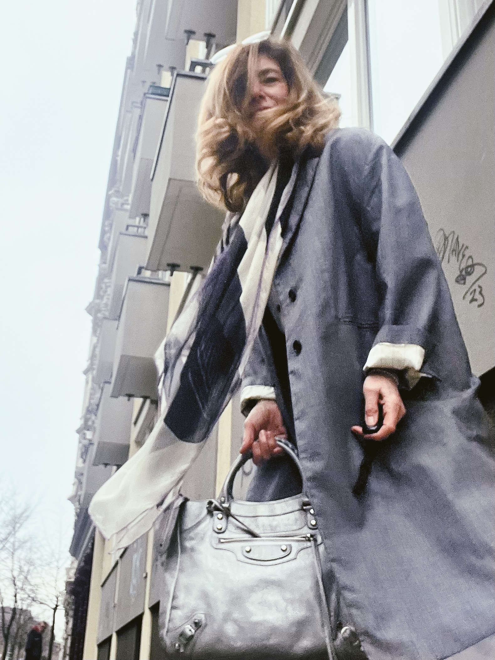 Und zu dem Mantel gesellt sich die Tasche von Balençiaga. Im Juni 2000 stellte der damalige Chefdesigner Nicolas Ghesquière sie erstmals für das berühmte Modelabel vor und nannte sie “City”. Seitdem ist sie nicht mehr wegzudenken unter den Klassikern. Typisch ihr Used-Look, als wäre sie schon lange eine Wegbegleiterin, auch wenn sie brandneu ist wie diese in matt-silber.