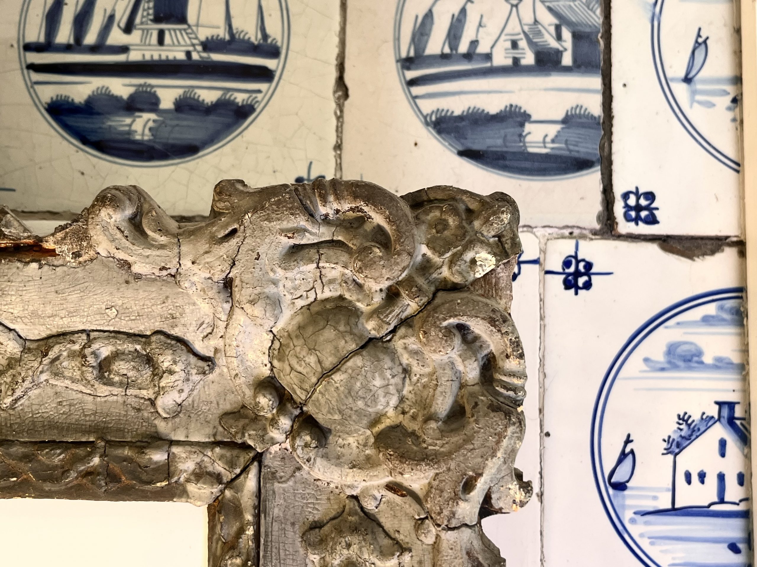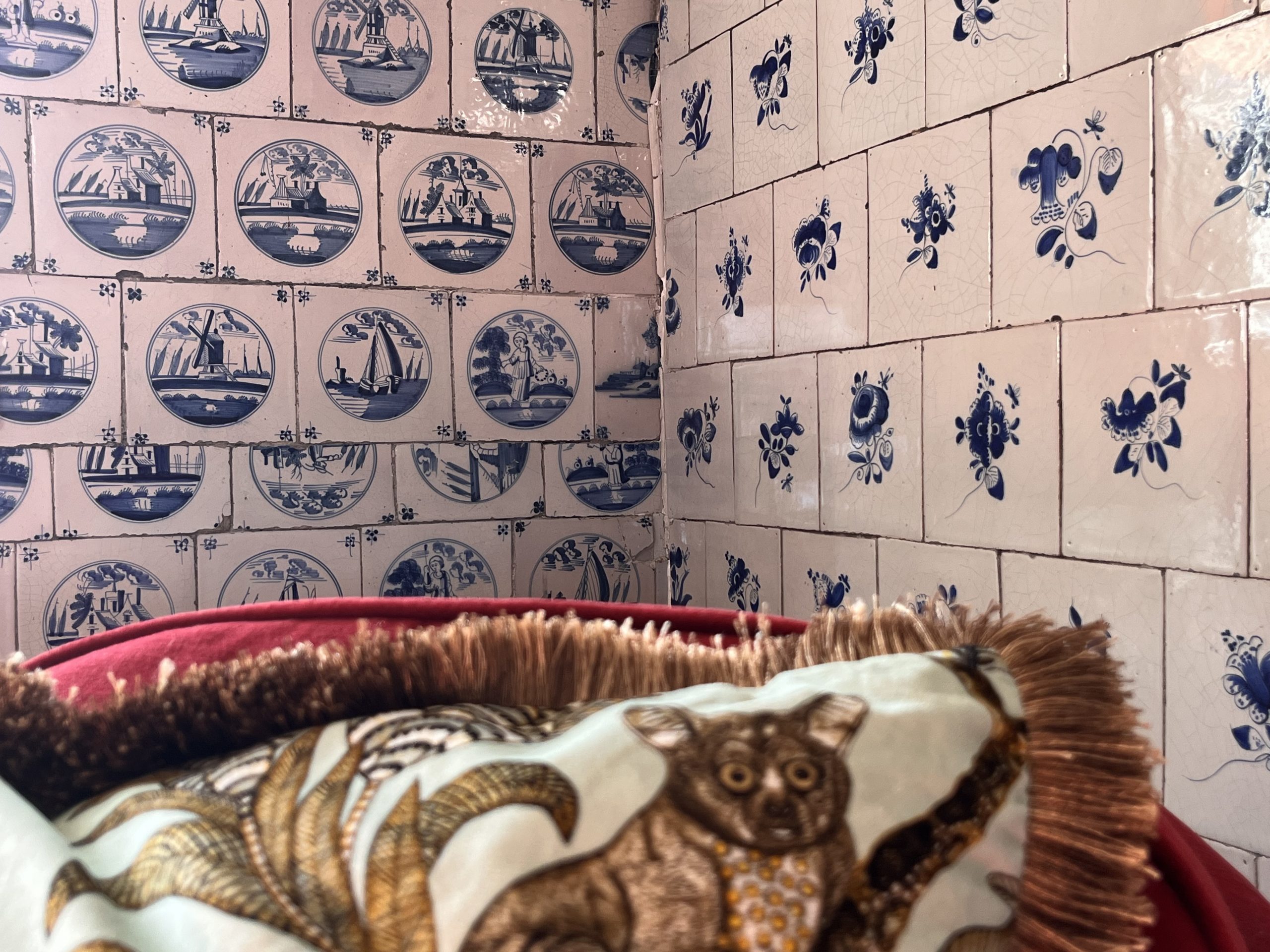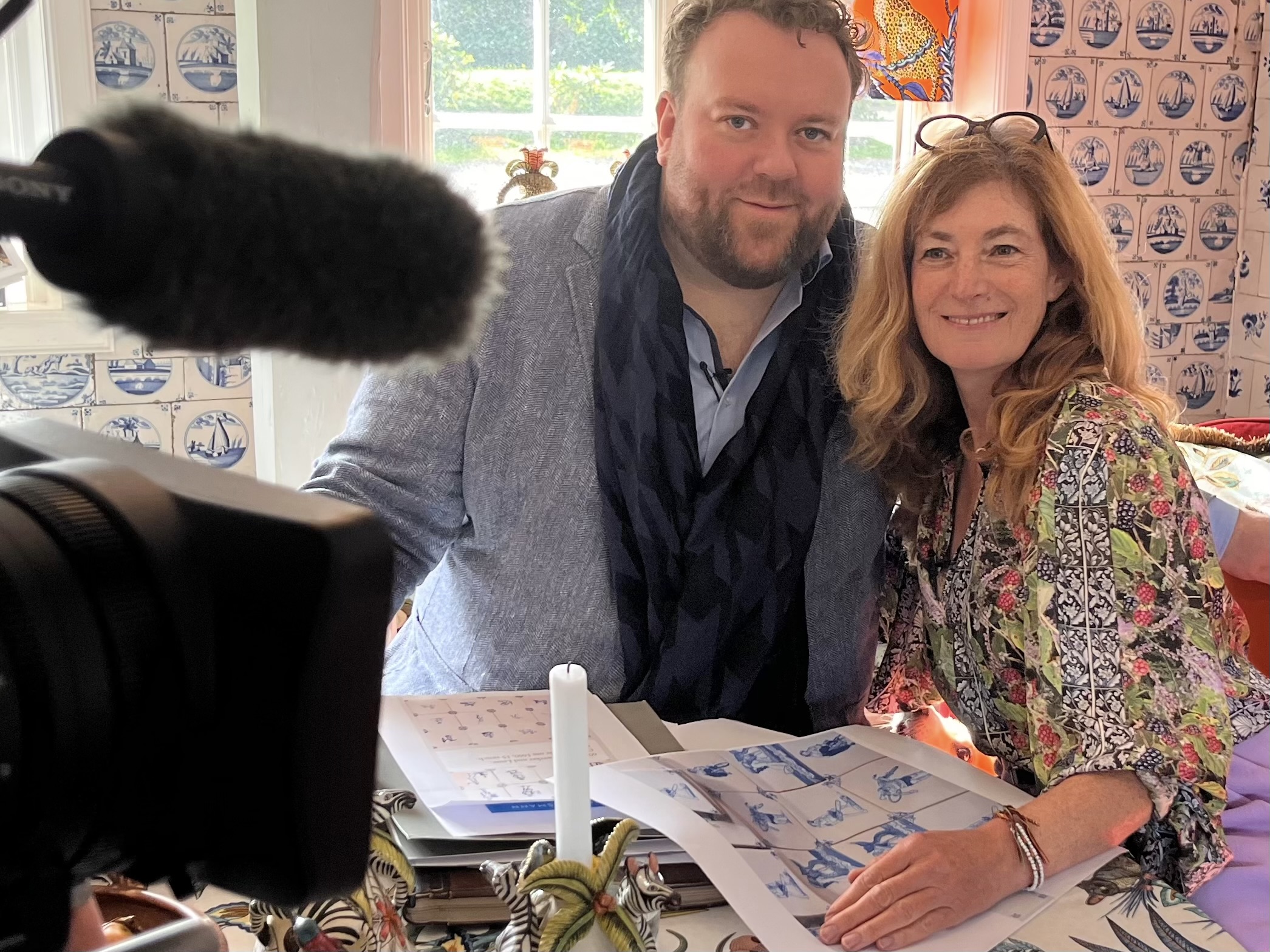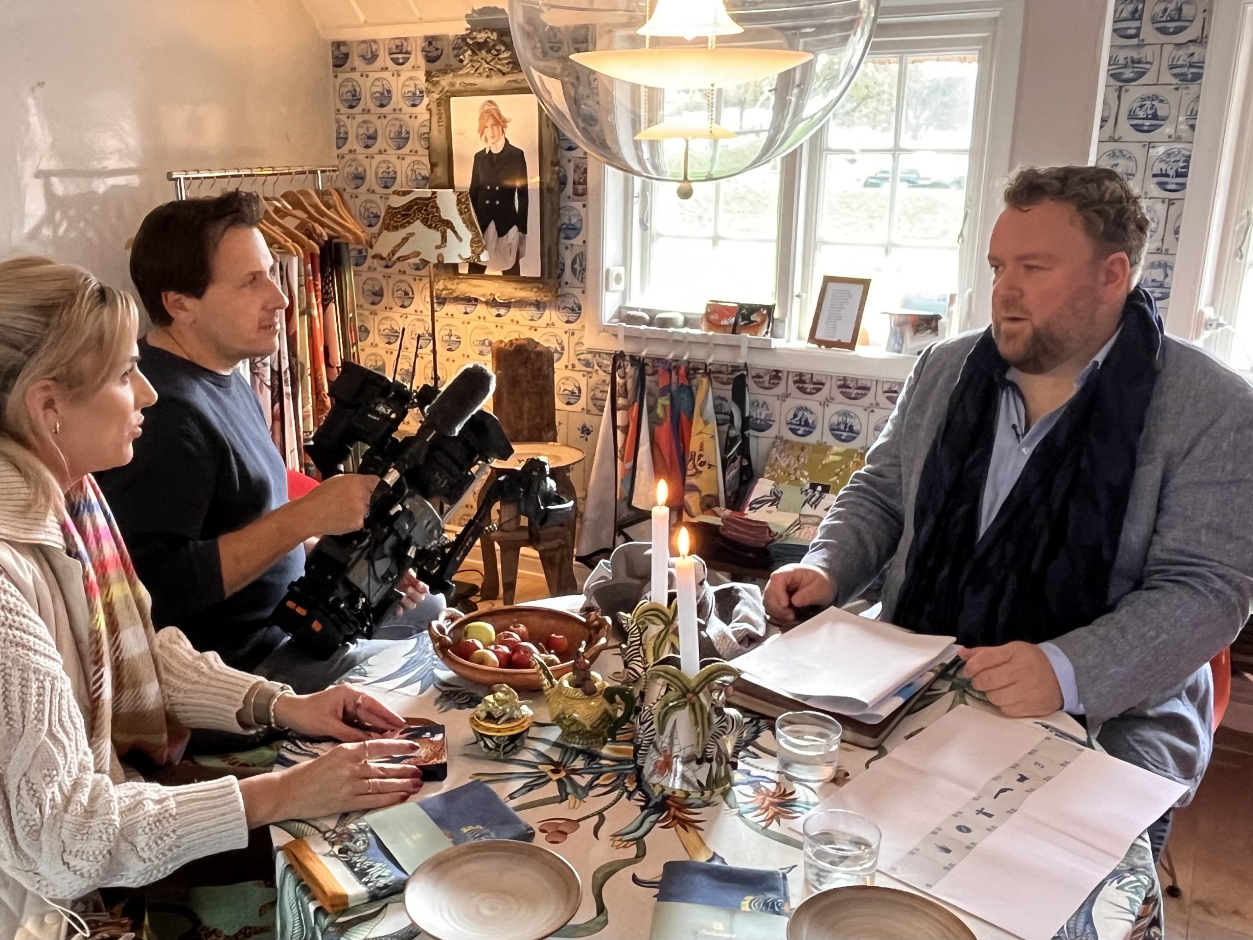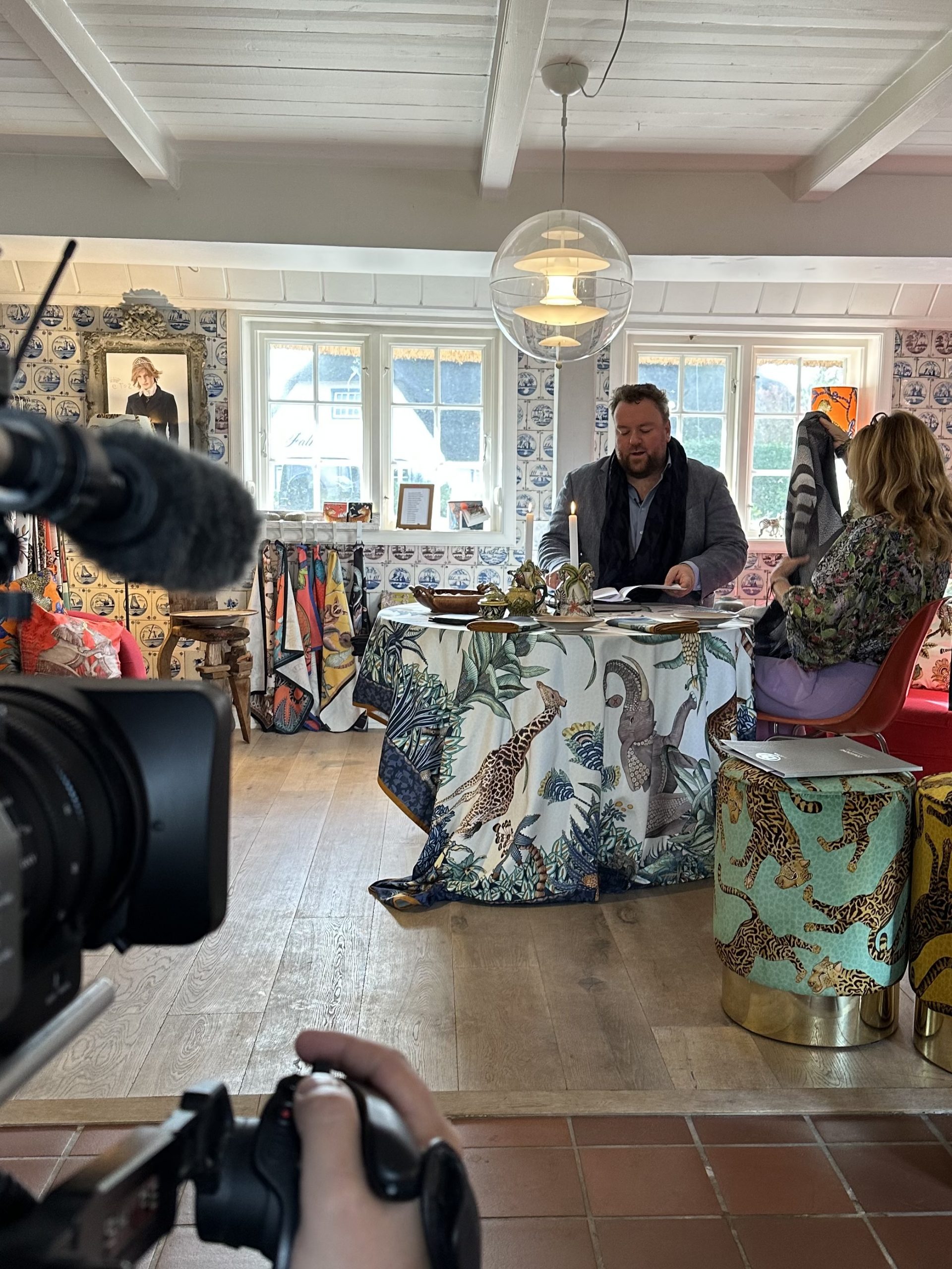 Warum bei uns das Treffen? Der zukünftige Schal (aus der Geschichte) mit den Fliesen-Motiven Corgie-Hund, Pistole, Leuchtturm, Kompass, Dünengras soll zukünftig exklusiv über Roma e Toska vermarktet werden.
