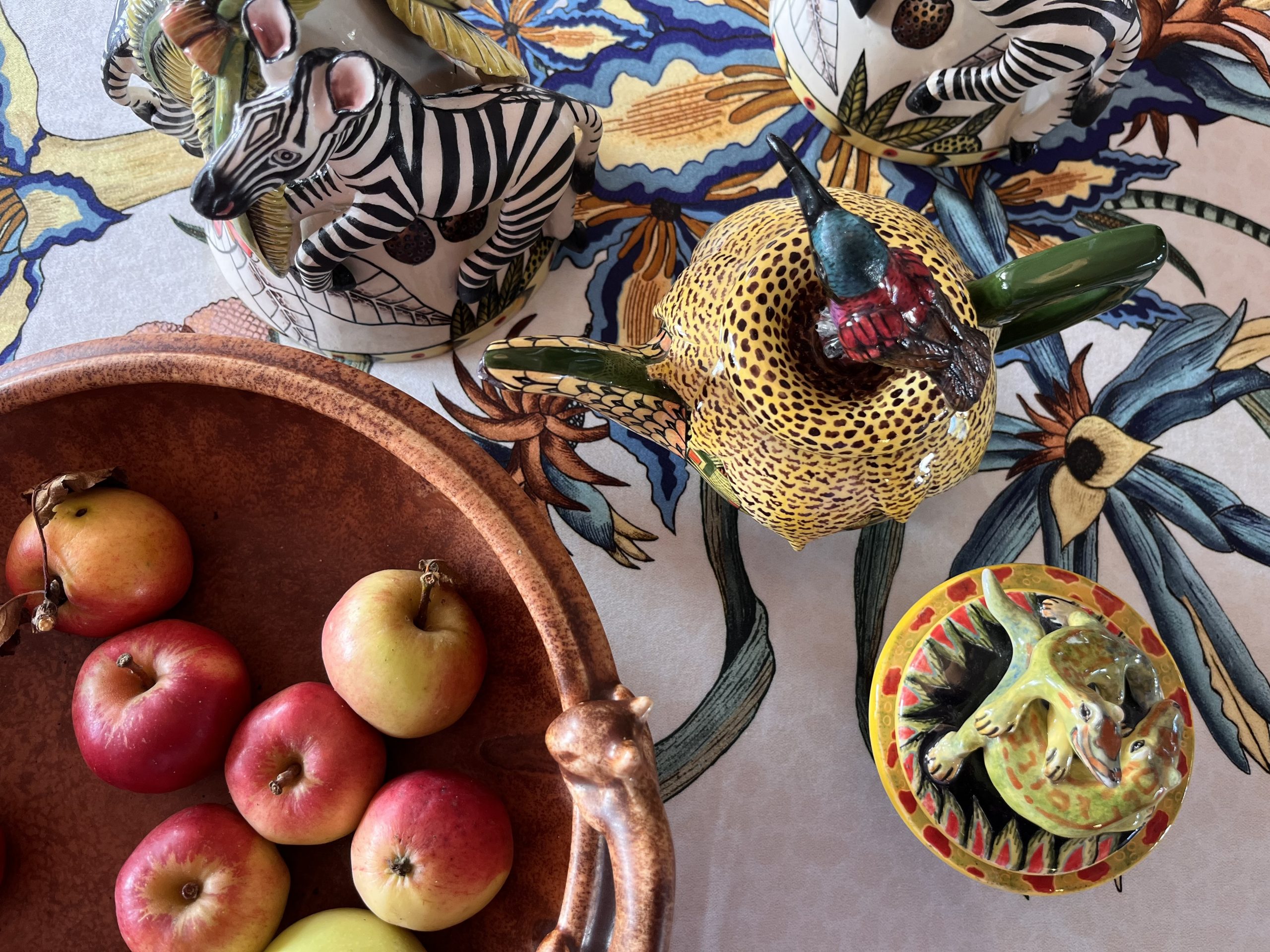 Schale Uffrecht, 1930 (€ 360), Keramik und Tischdecke ARDMORE