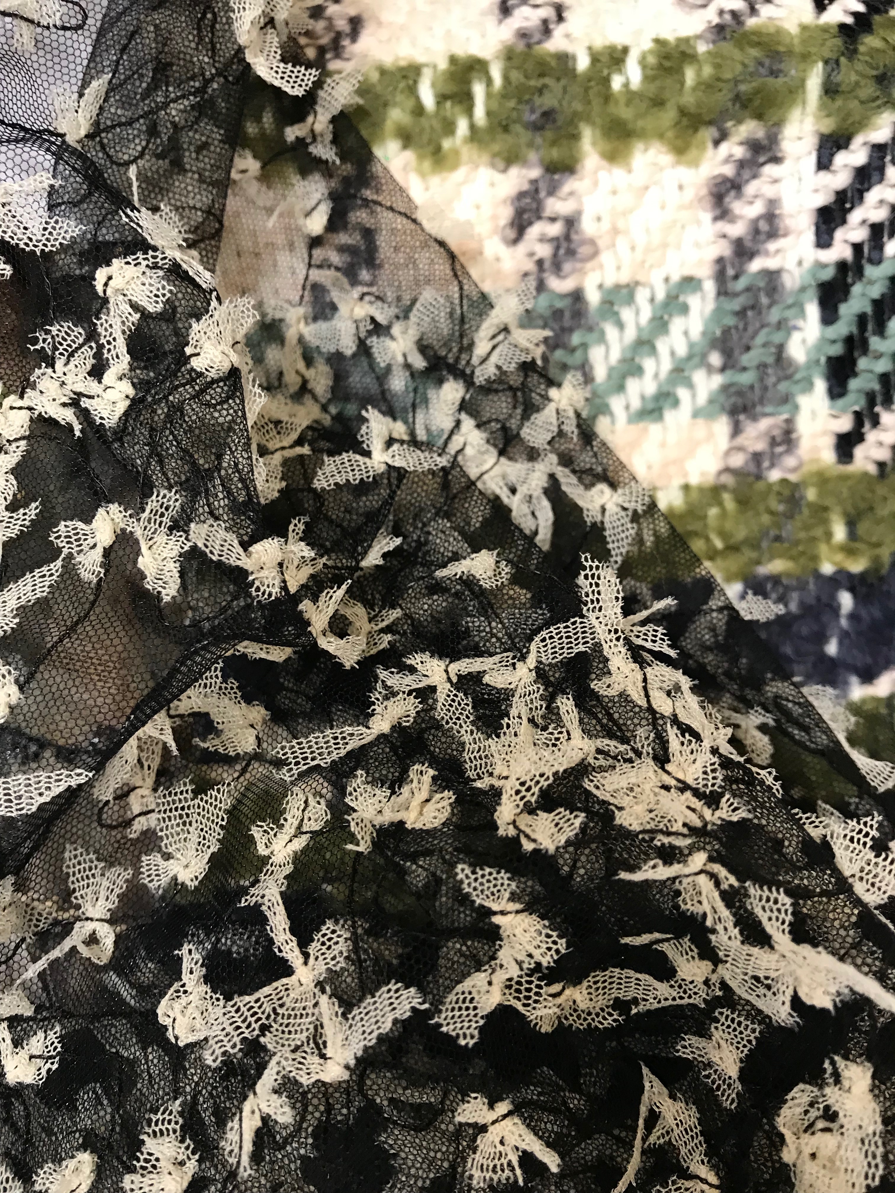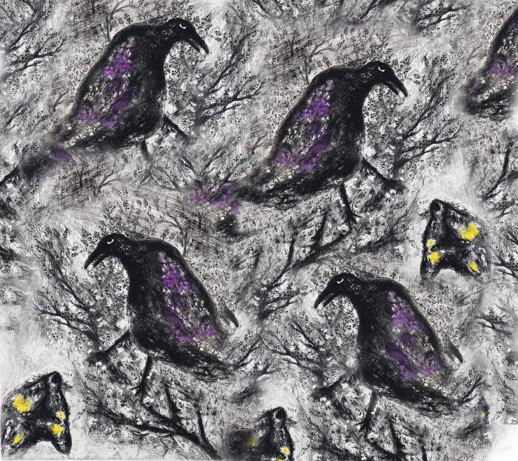 …, denn vor meinem inneren Auge hat sich schon das ganz Kollektions-Puzzel zusammengesetzt: die schwarz-weißen Radierungen von Doré als Seidenprints und Futterstoffe, dazu die bestickten Tülle aus Oberitalien und die Wolljacquards aus Lyon, von Chagall inspirierte Farbdrucke als Futter in lilafarbenen Trench-Coats …