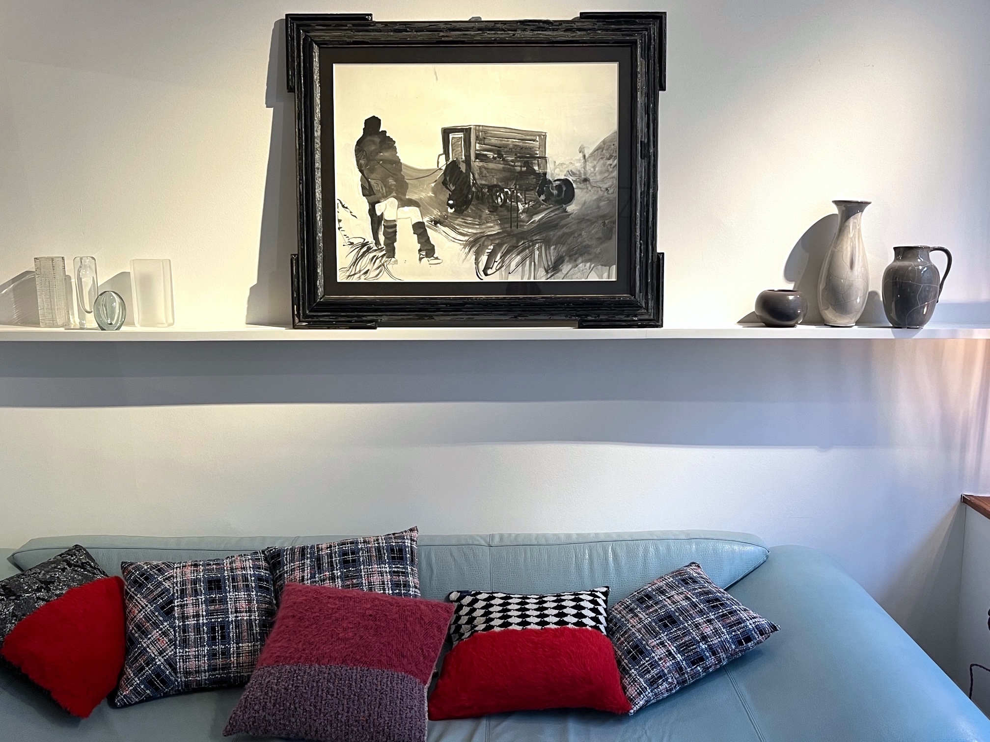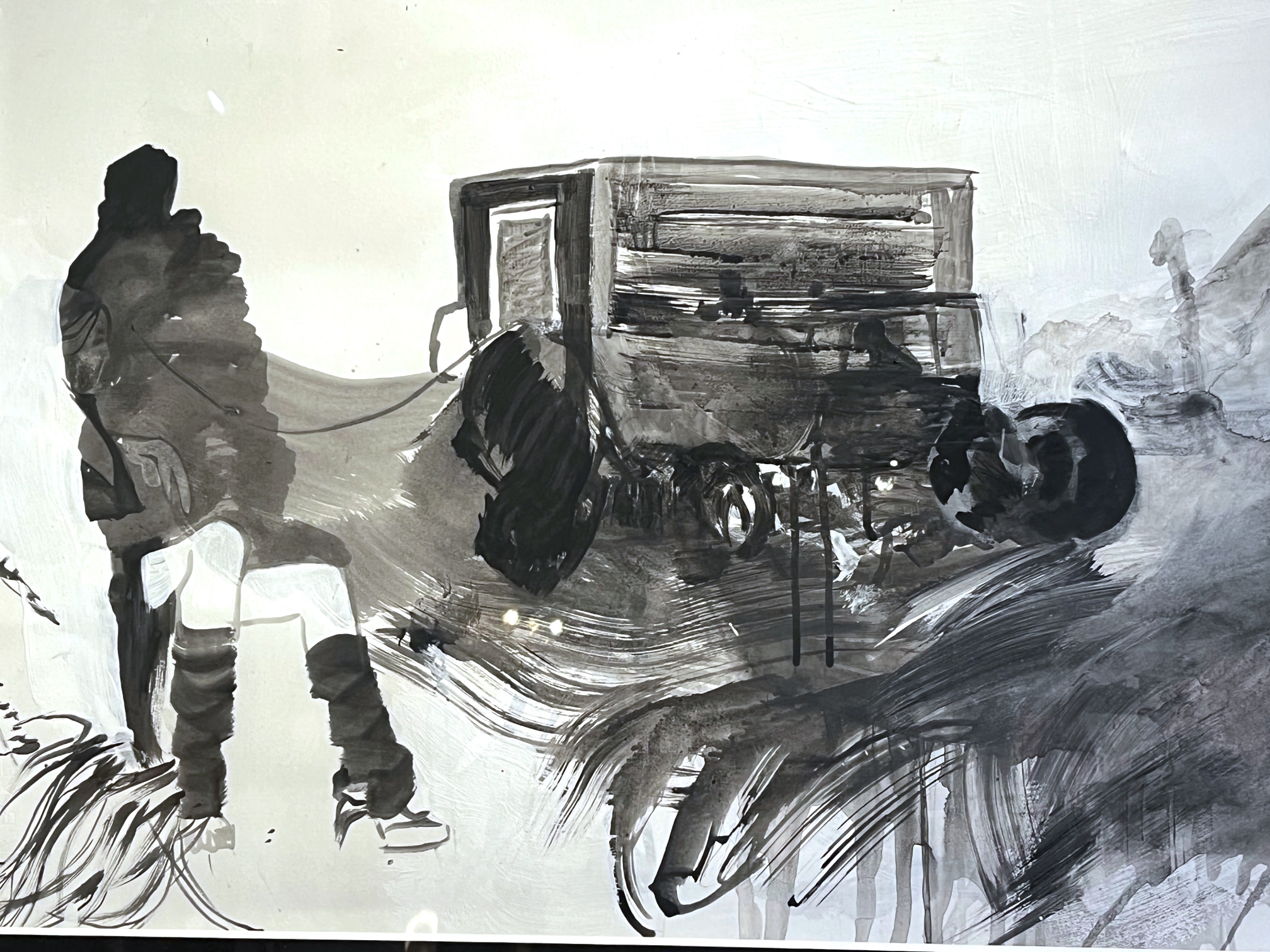 Ein Kunstwerk, eine Erinnerung an ein Buch aus der Schulzeit, dann das Buch, die Vasen in der passenden Farbe, eine Bluse und noch eine … Die Aufzählung könnte so weiter gehen, draußen Regen und Kälte, die Menschen huschen gebeugt mit Regenschirmen vorbei. Immer wieder schaue ich rüber zu dem Bild von Alexandra Vogt, es fesselt mich: Eine Kutsche, daneben eine vermummte Frau, Schlamm überall. Ist der Karren in den Dreck gefahren oder ist es eine Reise mit einer Unterbrechung? Irgendetwas stimmt nicht. Aber was?