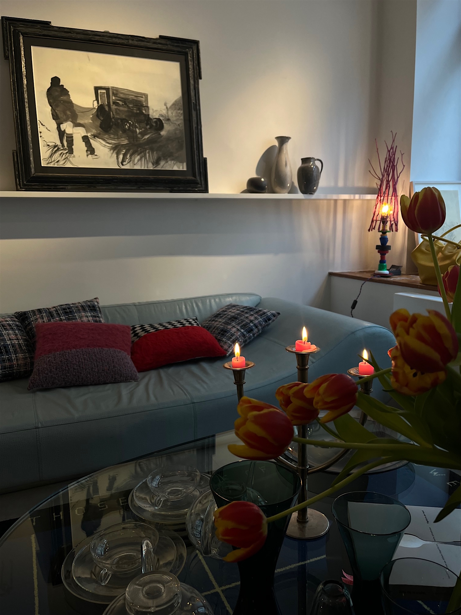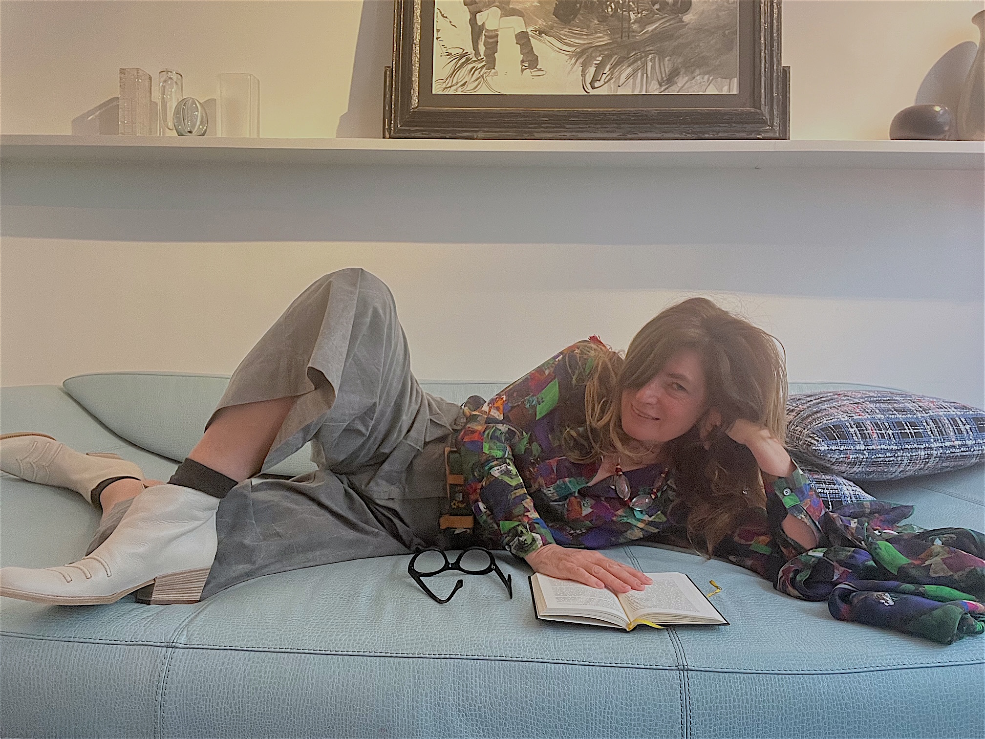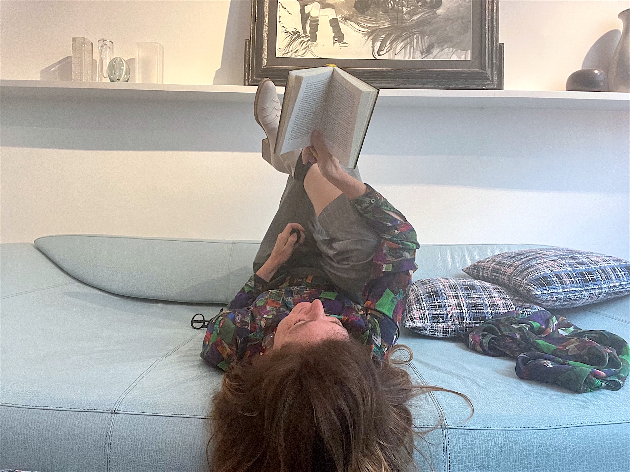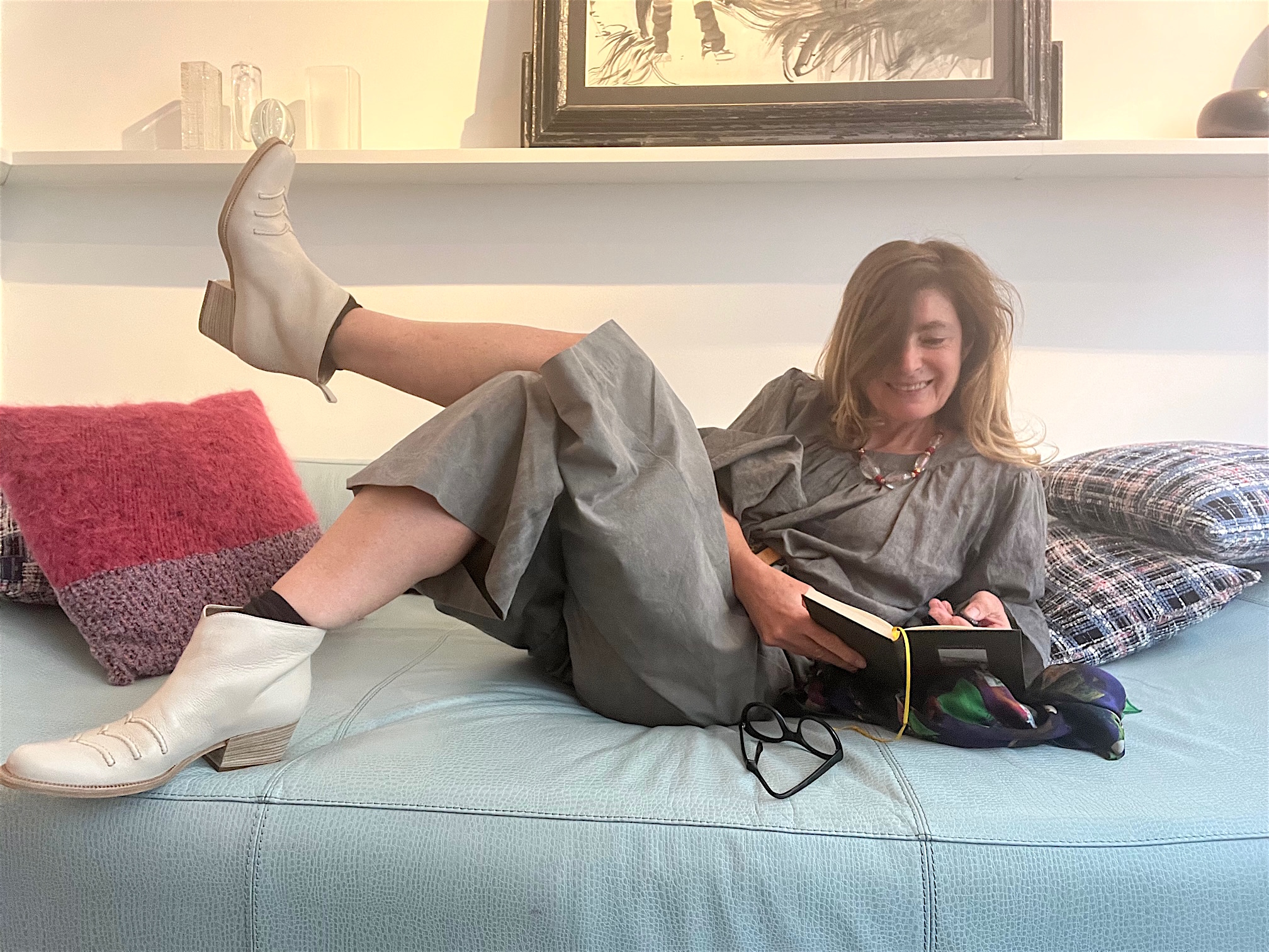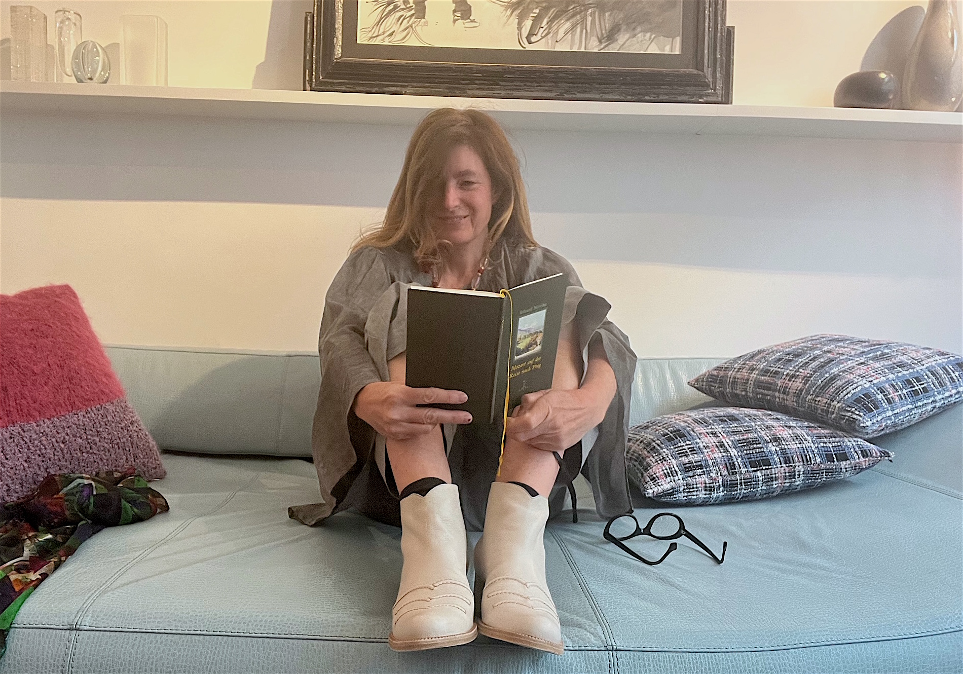 Mittlerweile habe ich schon vergessen, dass ich mich in einem Geschäft befinde mit großen Fensterscheiben, durch die ab und an jemand amüsiert hineinschaut und mich lesend auf dem Sofa sieht. … Es ist spät geworden im Schloss. Noch einmal geht Mozart an das Klavier: