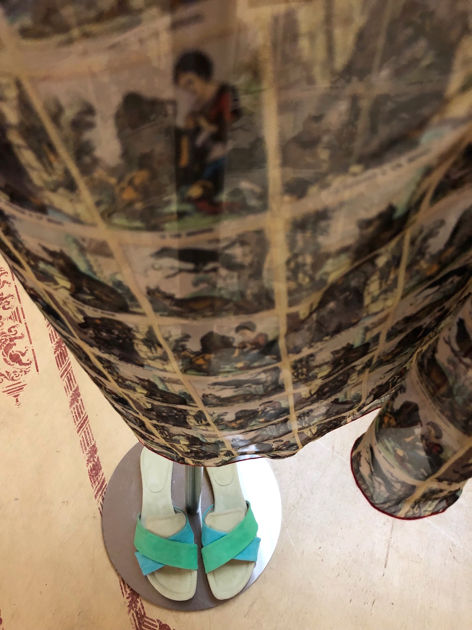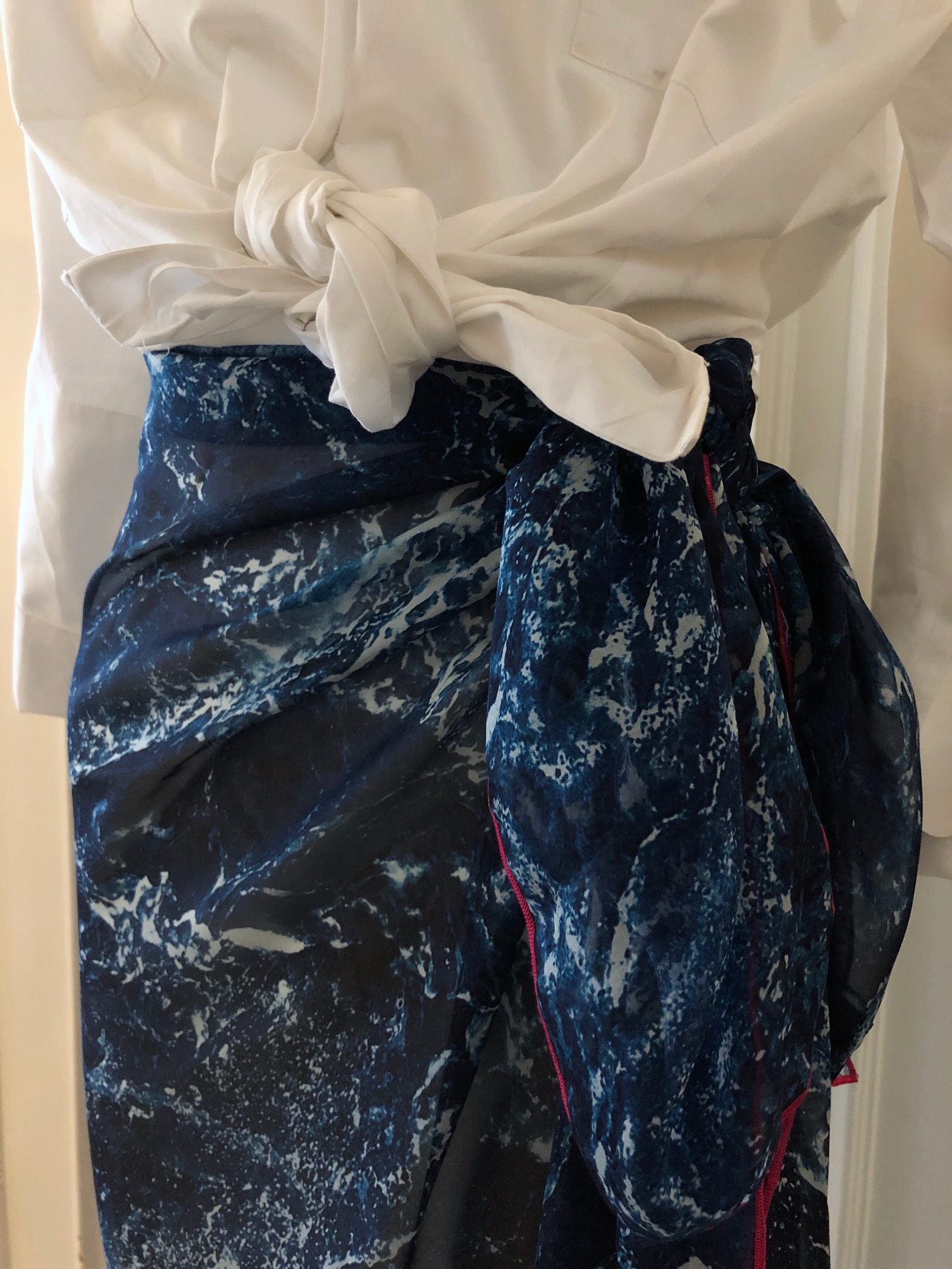 Und weil es so schön aussieht, gibt es das gleiche noch einmal in “Illustration Jean de La Fontaine”, ebenfalls als Seidenchiffon Schal, den wir hier zum Hüfttuch gebunden haben (€ 198), passend kombiniert mit der Matrosen Bluse in weiß (€ 298) und einem Vintage Yves Saint Laurent Gürtel (€ 390) und Kette (€ 900). Übrigens das Hermès Abendkleid im Hintergrund mit Waterscape Rock vom Wiener Opernball auf der MS Europa gibt es auch zu kaufen, Größe S (€ 790).