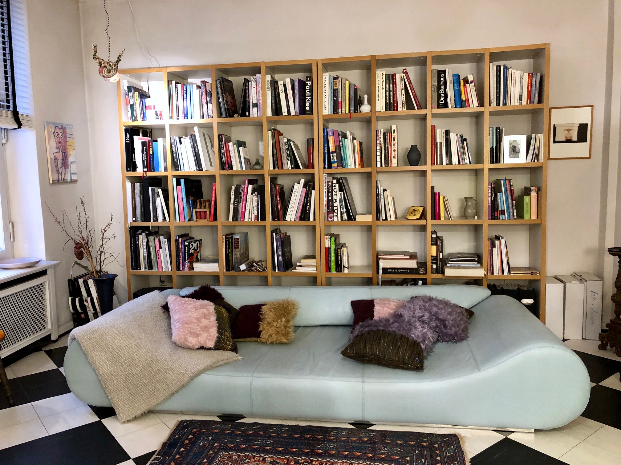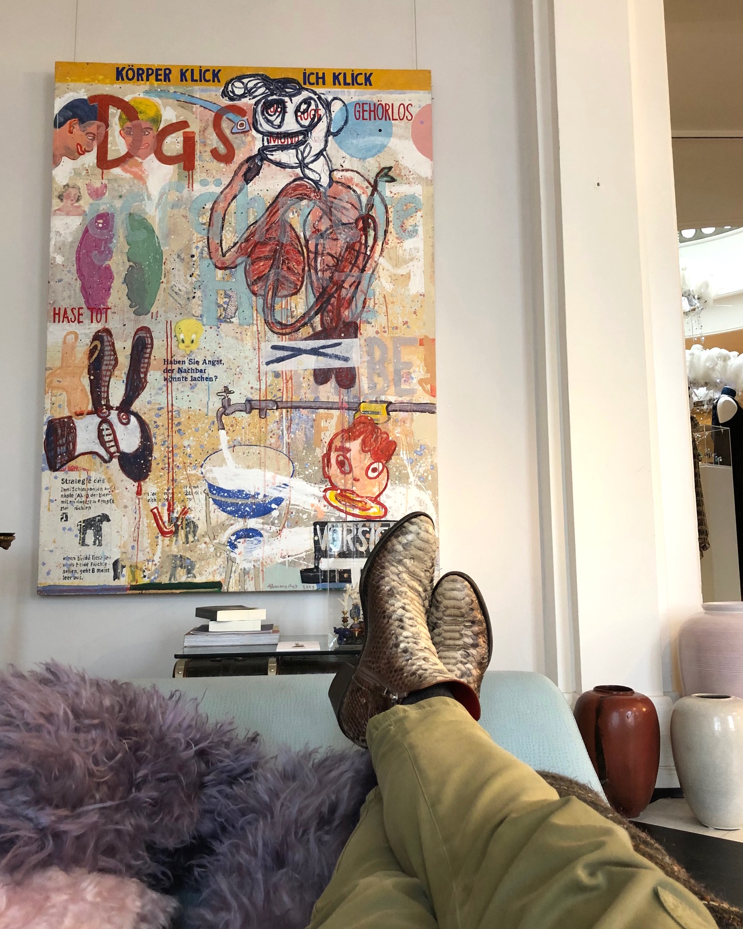 Abb: Gestern Nachmittag mit Müdigkeitsanfall (Jetlag) auf dem außergewöhnlichen Vintage Fendi Sofa (€ 7.900) zwischen Kissen und unter dem Bild von Dieter Glasmacher (€ 16.000).
