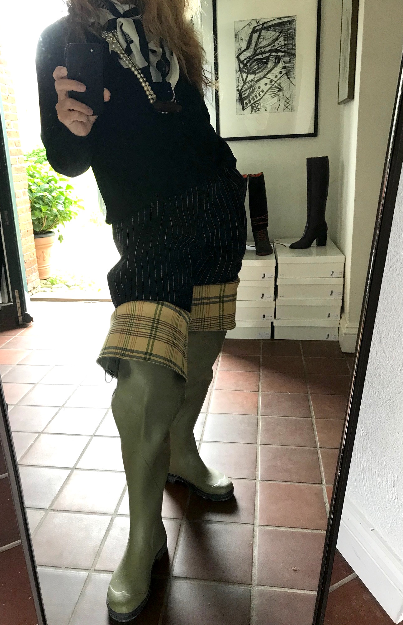 Abb: Kurze Nadelstreifen Hose (€ 398), Day-and-Night Pullover (€ 398), Vintage Yves Saint Laurent Tuch (€ 249), Le Chameau Fishermen’s Boots (SP € 150)