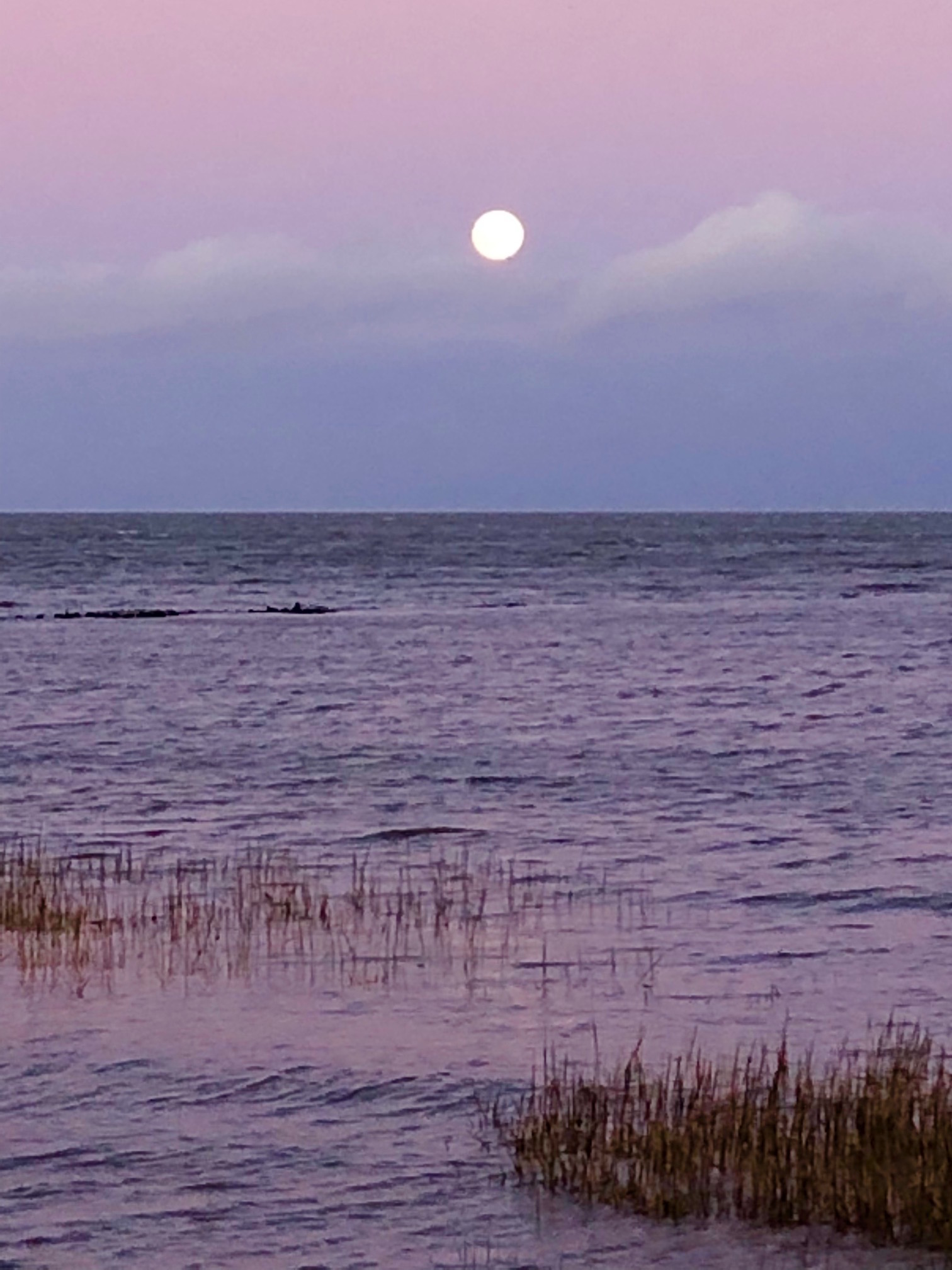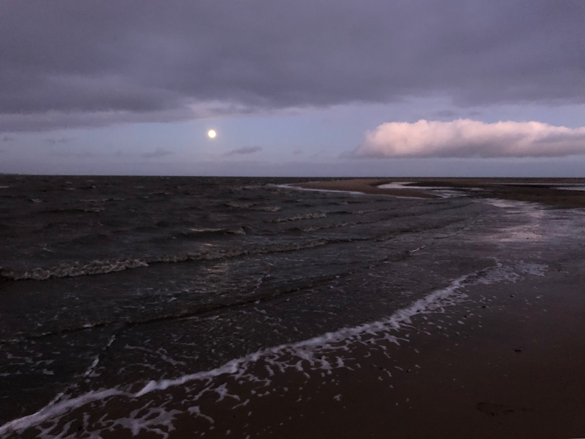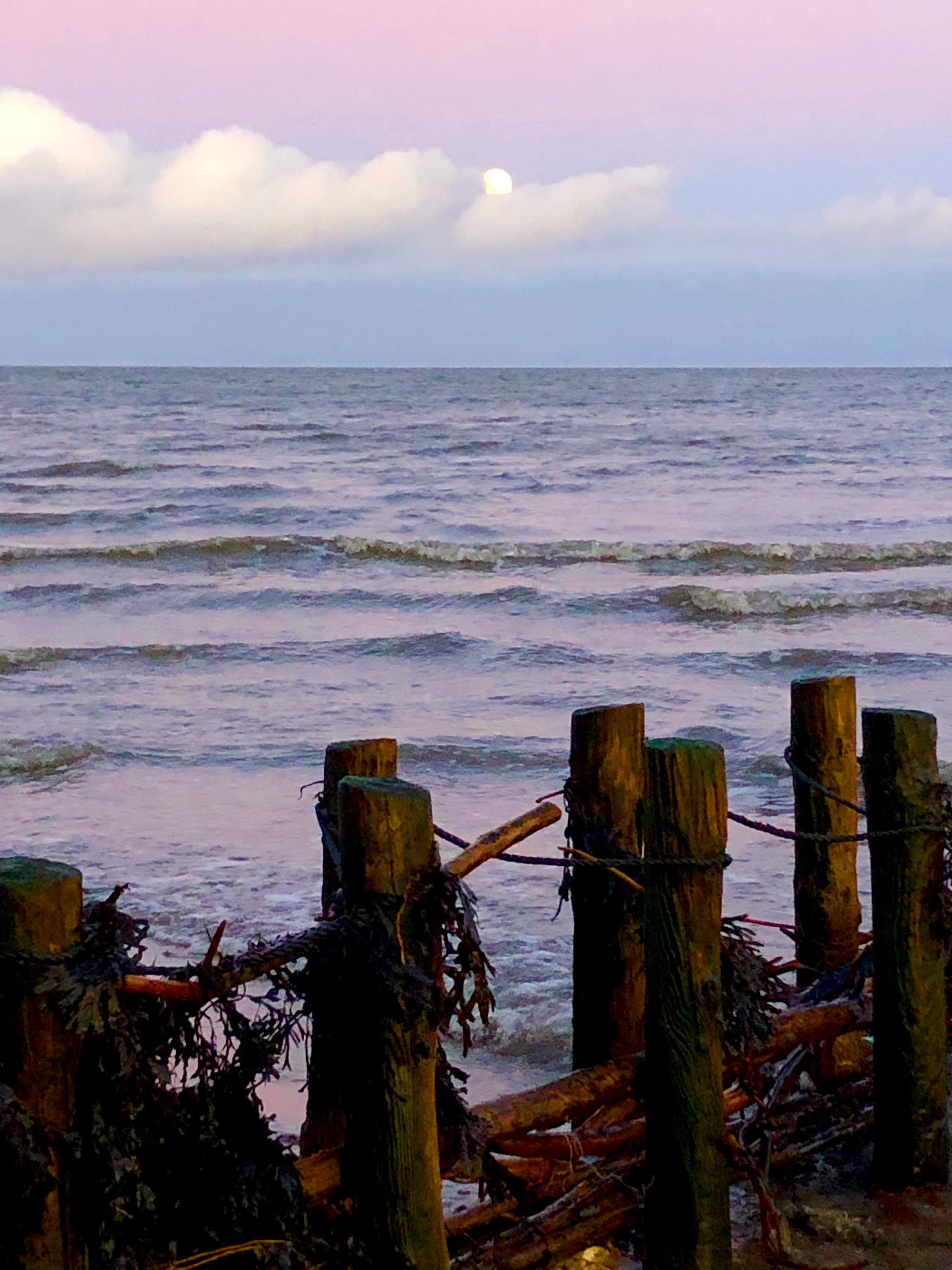 Der Himmel färbte sich zartviolett und plötzlich kam der Mond heraus, voll und hell und so riesig. Ein Mond ganz für mich allein, denn rundherum gab es keine Menschenseele, die Insel ist entleert. Und so lief ich entlang des schmalen Strandes, der Wind kräuselte die Wellen, ansonsten eine Stille, die die Gedanken in alle Richtungen laufen lässt.
