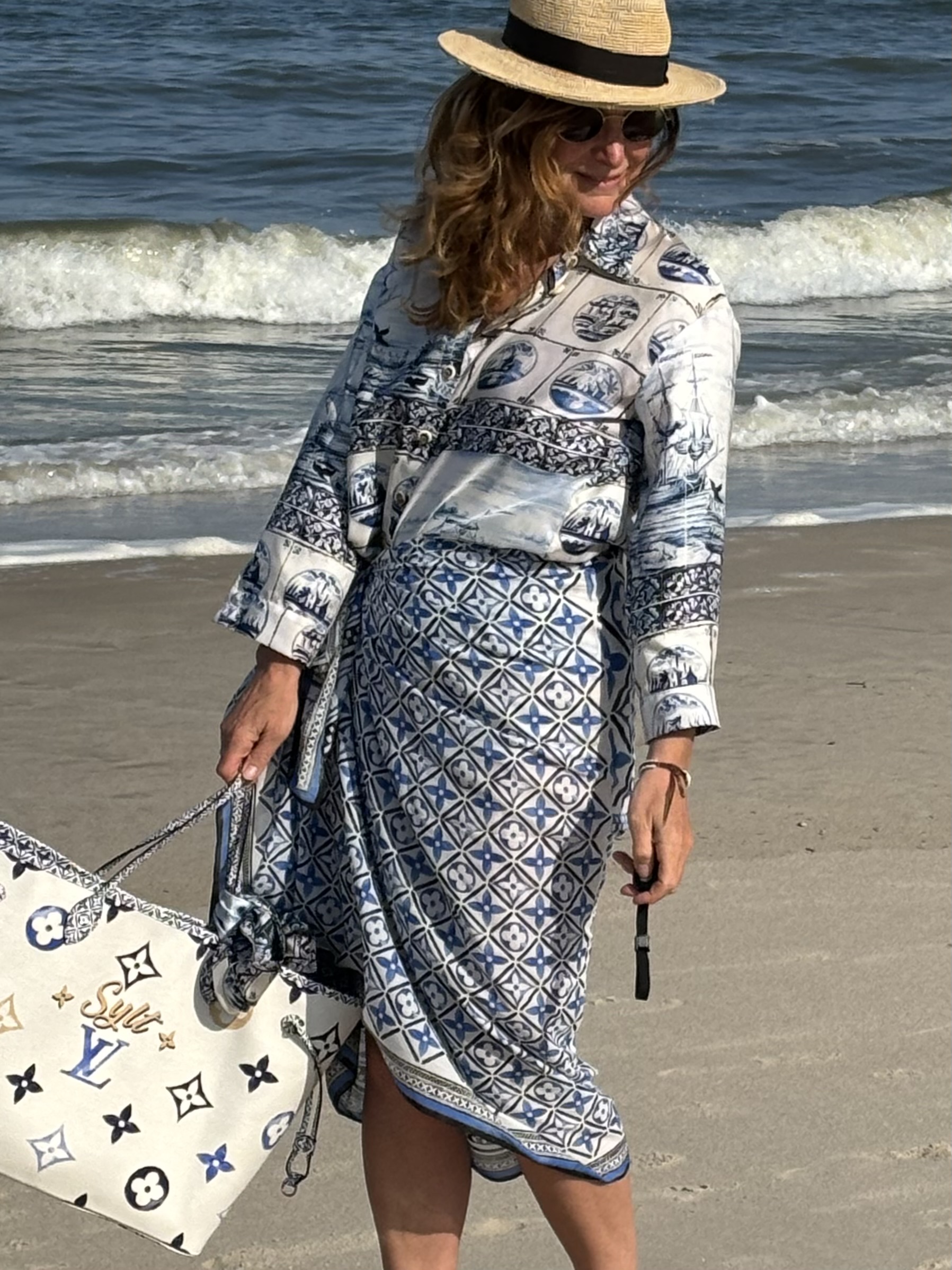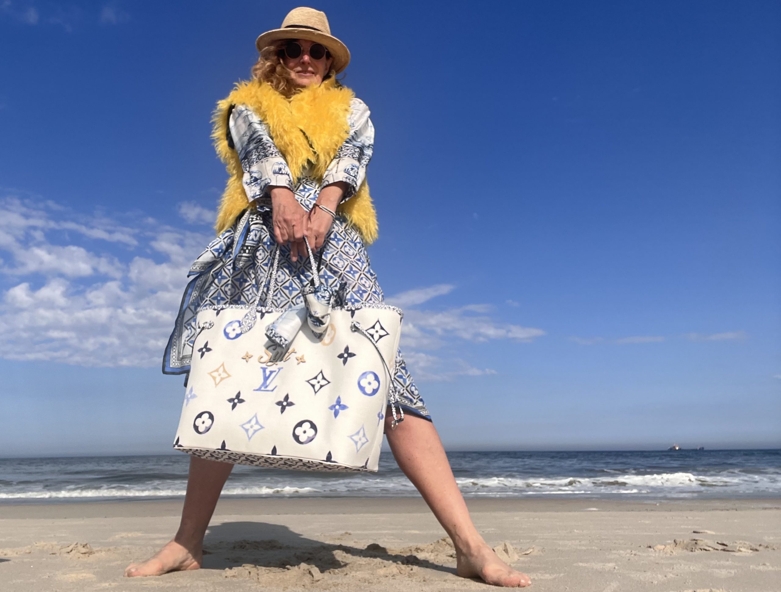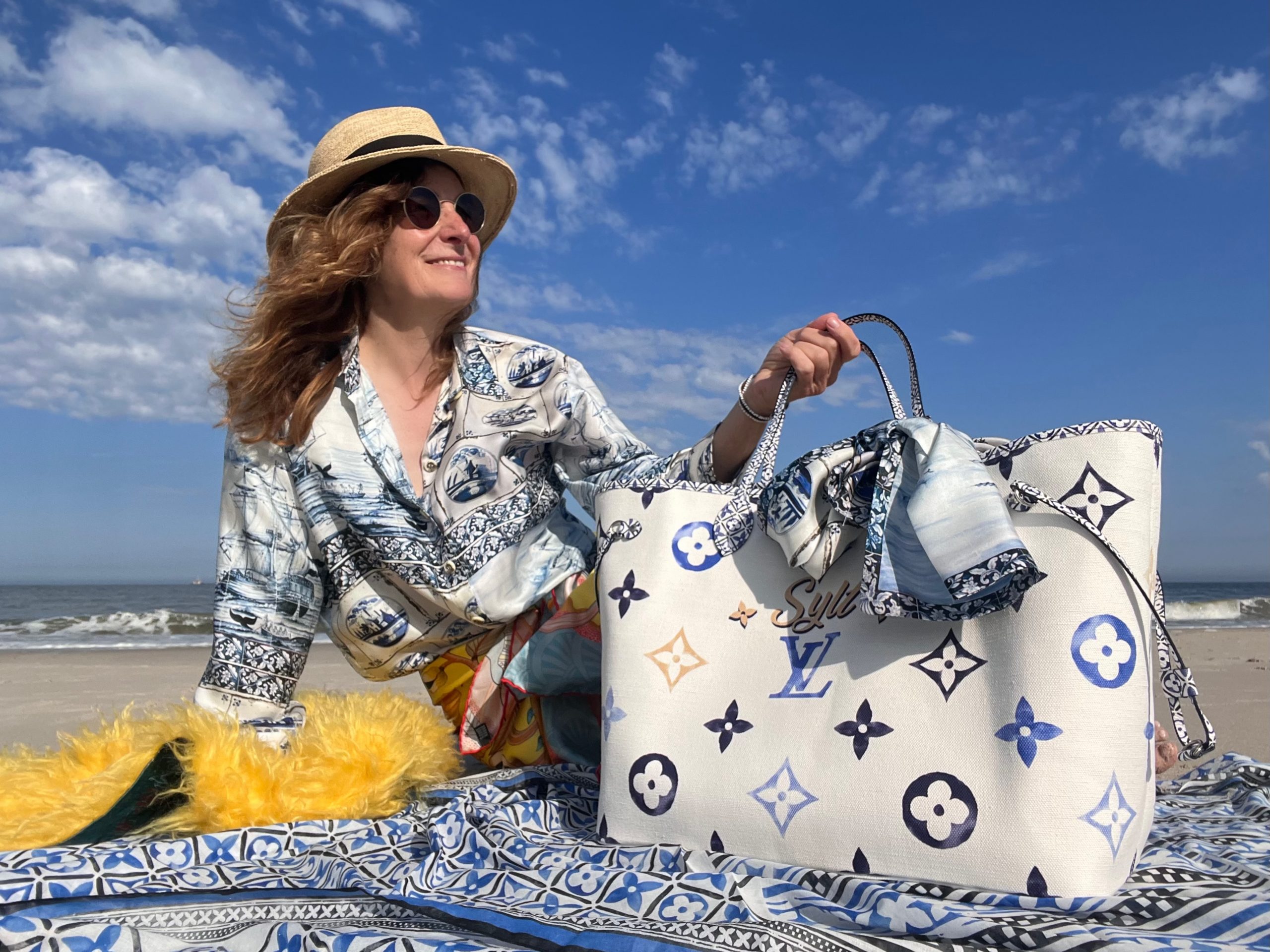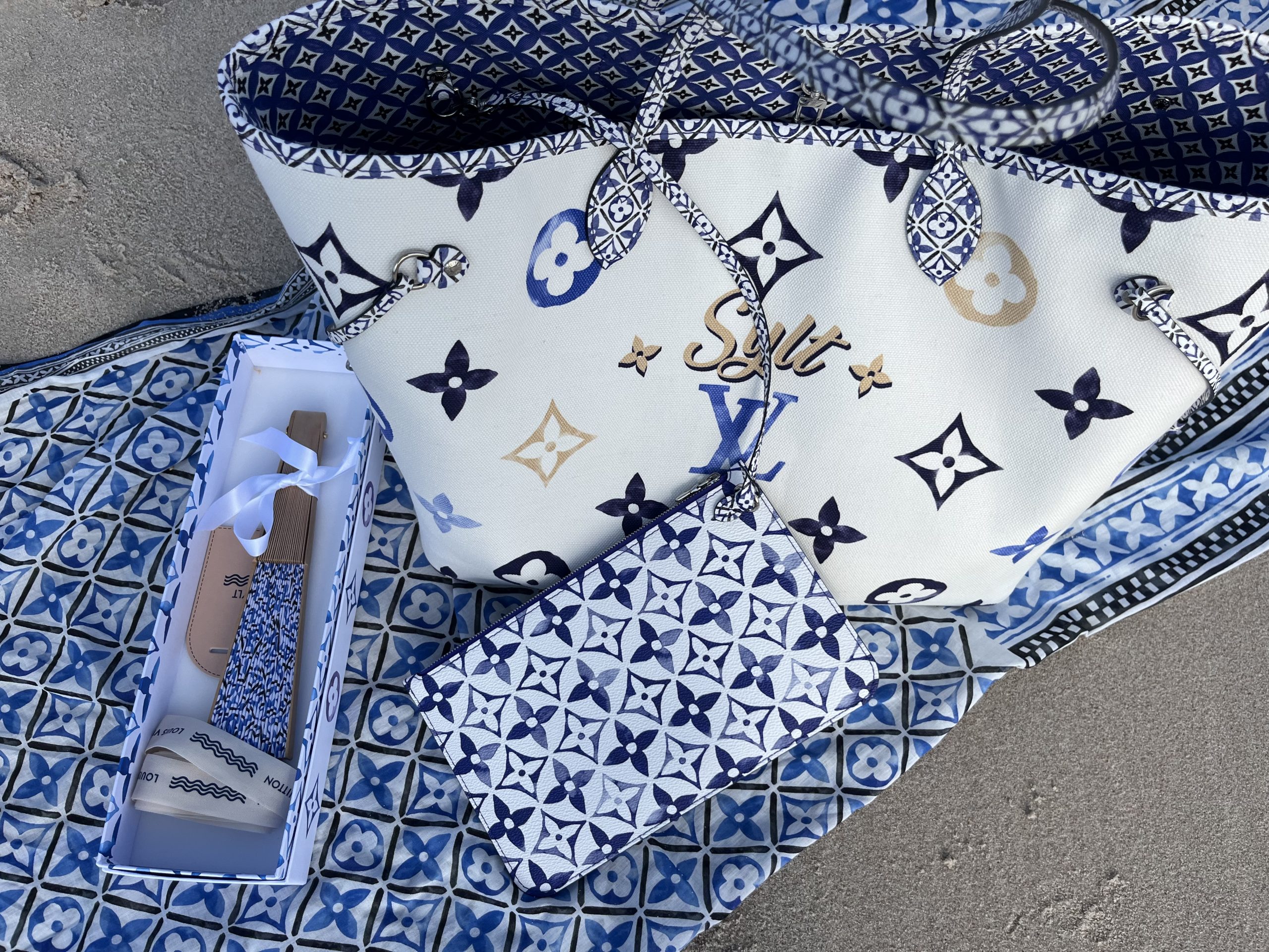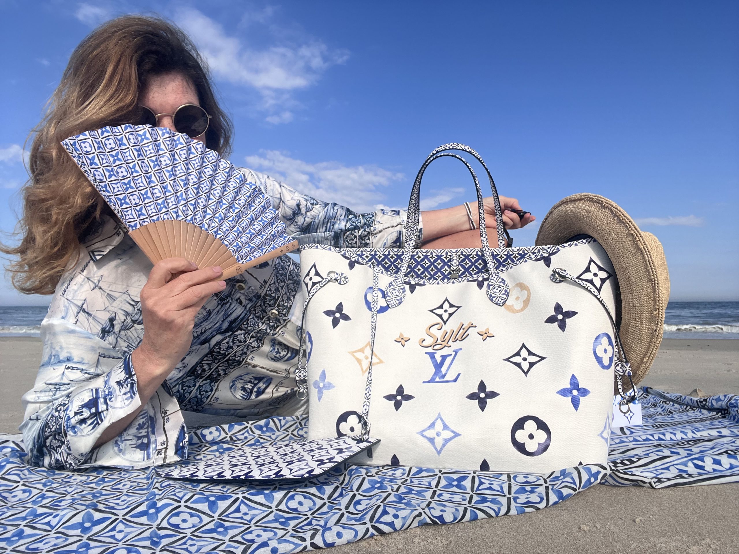Die Tasche, die ich hier aus Privatbesitz verkaufen darf, ist eine Edition aus 2023: Sylt! Auflage 200, reserviert nur für gute Kundinnen und sofort ausverkauft. Zu ihr gehört nicht nur die blau-weiß Monogramm Tasche, die an die Delfter Kacheln erinnert, sondern auch das Strandtuch, die Pochette, ein Fächer, Hangtag und natürlich der Staubbeutel.