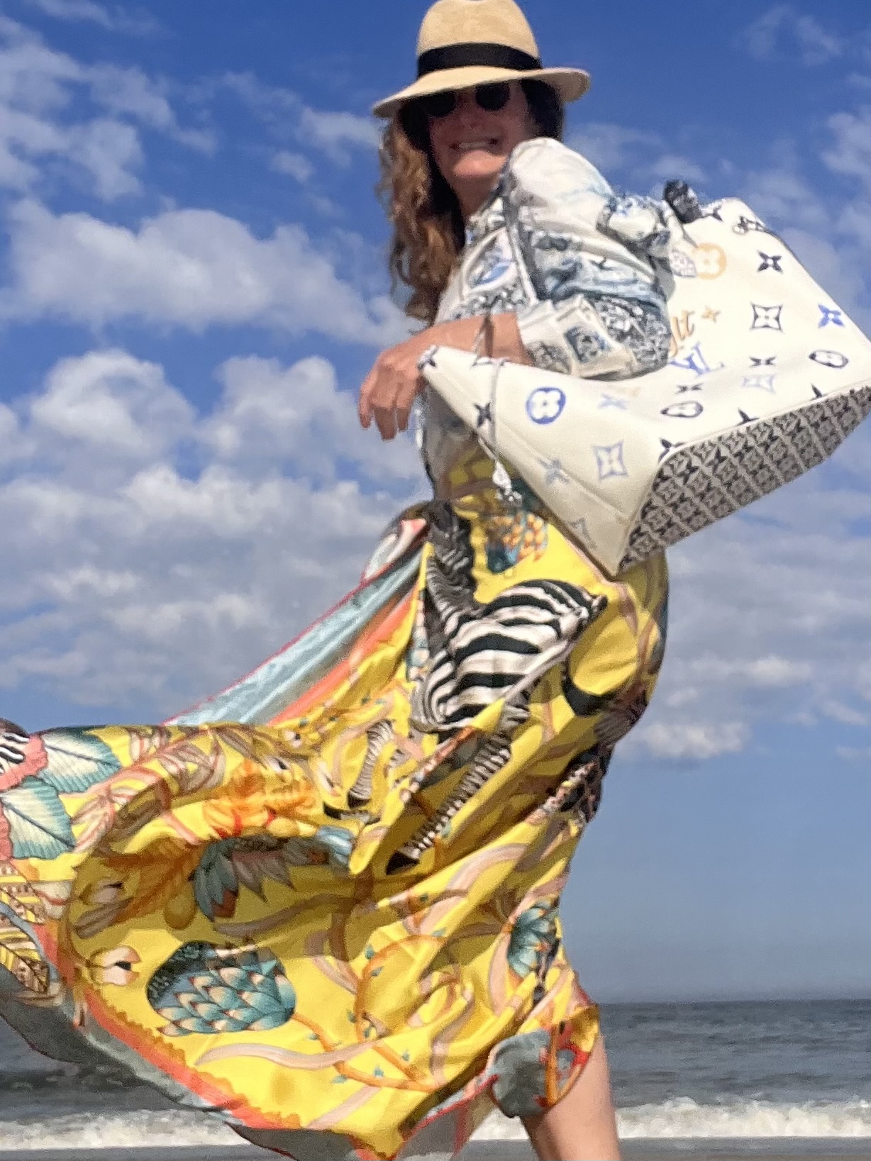 Mein Look flirtet ebenfalls mit dieser Taschen-Edition: Delfter Seidenbluse (noch ein Expemplar in S), Seidenschal, Afrika-Tuch von Ardmore um die Hüften geschlungen und der old-school Strohhut von Stetston.