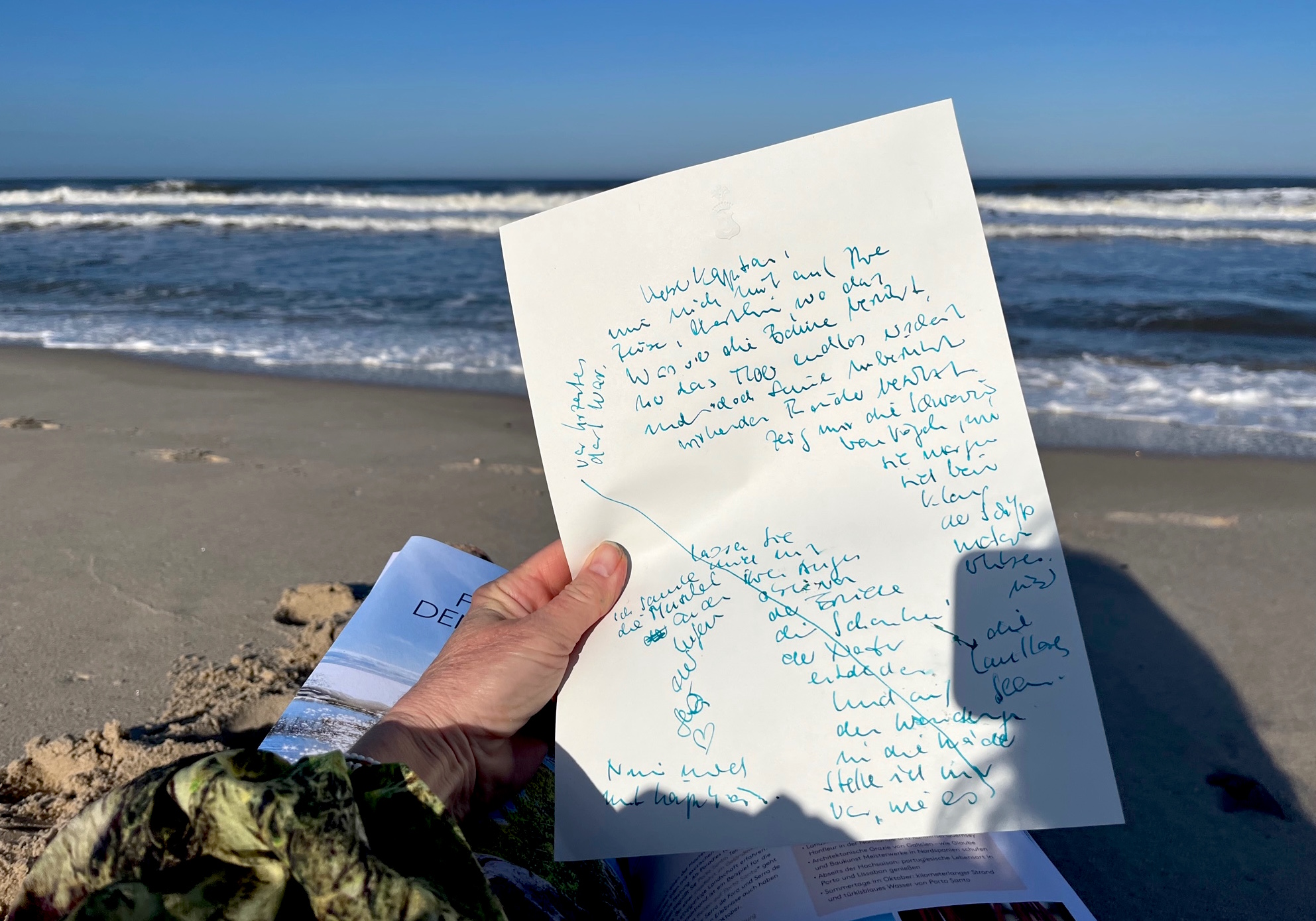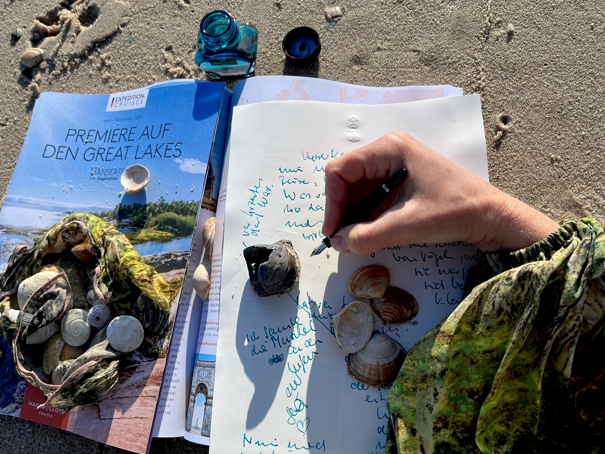 Los geht’s! Und ich bringe Euch bei, wie man begeisterte und einfühlsame Briefe nach Hause schreibt, in denen sich das Blau mit dem Grün verbandelt, die Wälder mit dem Meer verschmelzen. Schiff Ahoi!