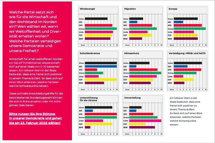 Analysiert werden die verschiedenen Wahlprogramme der Parteien. Hierfür wurden 11 Kategorien verwendet: Europa. Migration. Wirtschaftliche Freiheit. Umverteilung. Weltoffenheit und Diversität. Verteidigung, Militär und NATO. Schuldenbremse. Windenergie. Wehrhafte Demokratie. Unterstützung für die Ukraine.