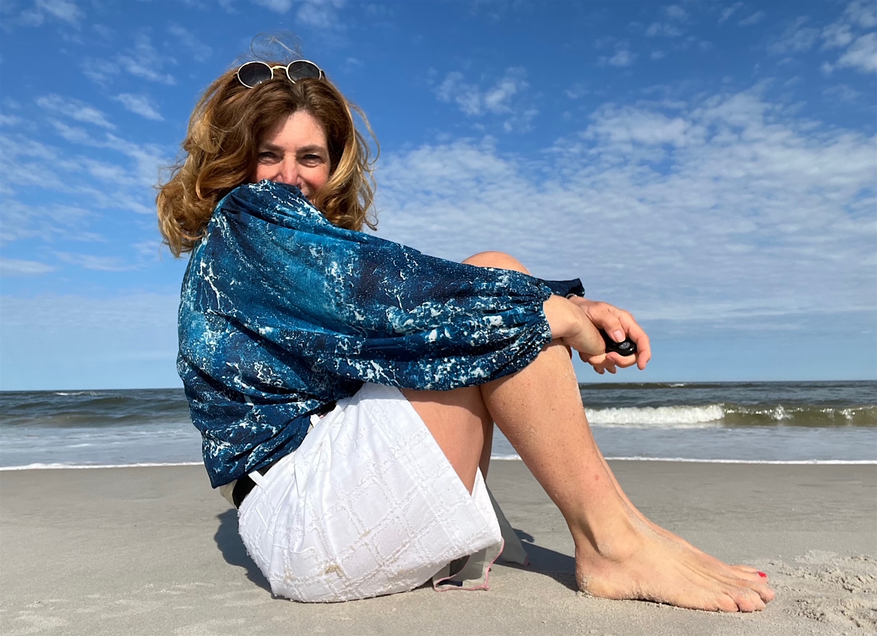 Wohin mich diese Bluse aus der Waterscape Kollektion nicht schon überall begleitet hat! Beinahe könnte ich sagen: einmal rund um den Globus, wie das Wasser durch die Ozeane strömt. Ein wichtiges “One-and-Only”. Die große Fotoarbeit von Ulf Saupe hängt bei uns im Kapitänshaus (€ 8.000).