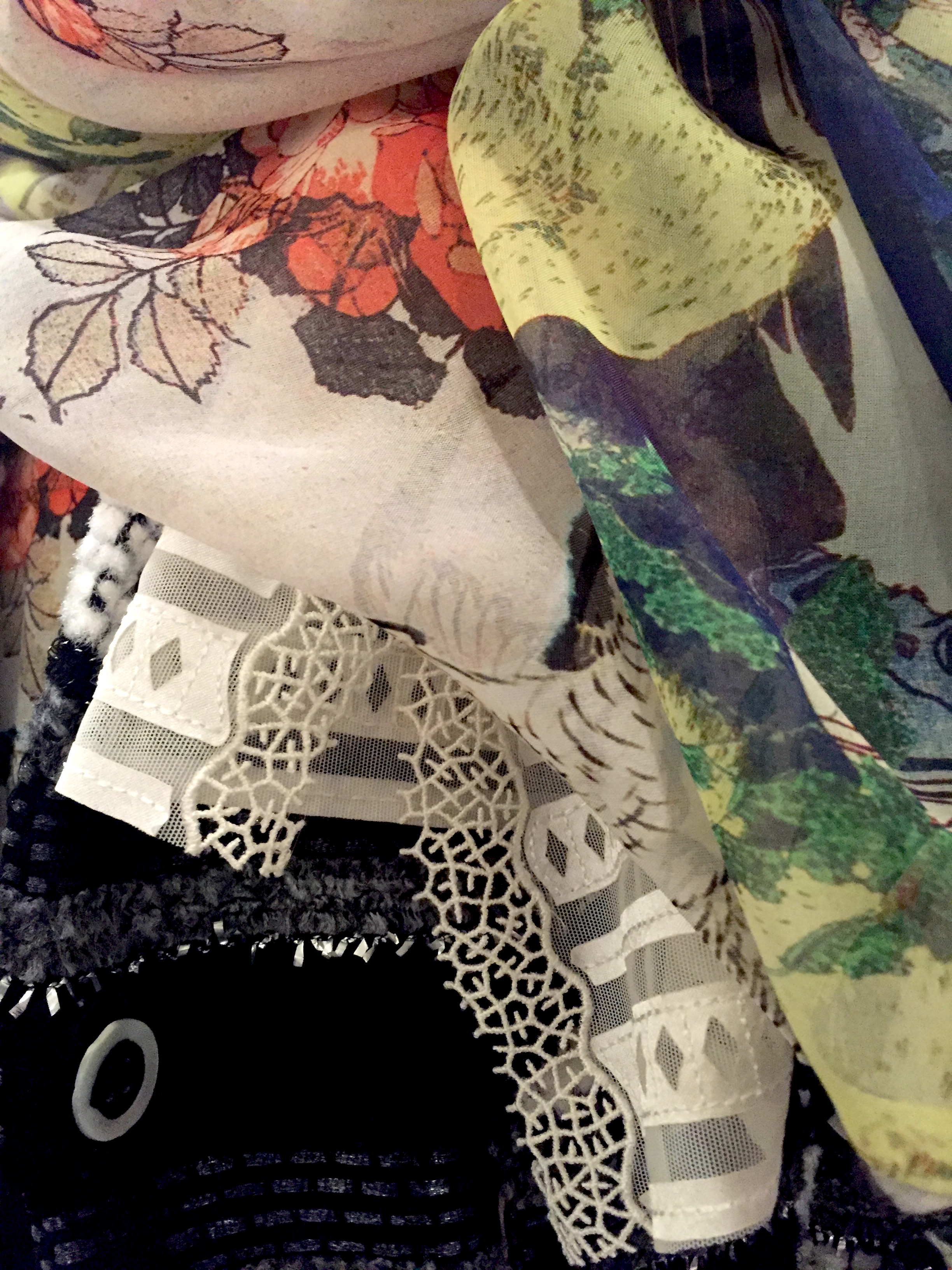 Und schon wieder gibt es einen neuen Unikatschal, diesmal in Kombination von Wasserfall, Vogel und Bäumen, gesäumt mit weißer Spitzenbordüre: Leicht, erfrischend und sehr poetisch. Wunderschön zur dunklen Coco Jacke. Auflage: 5. € 279,00