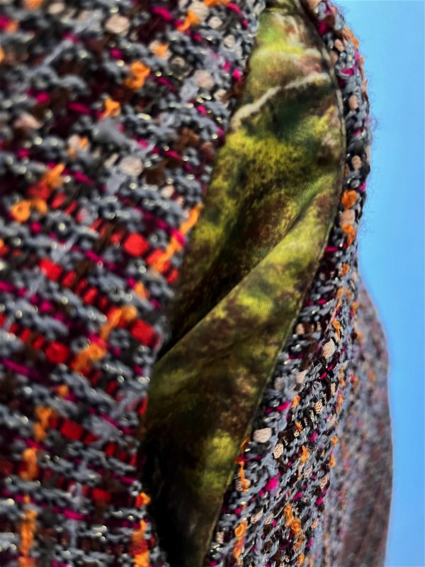 Swinging Fifties, dieses Modell ist wie die Musik. Der Schnitt ist raffiniert, eng in der Taille und dann als Teller mit raffinierten Nähten, die den Stoff in senkrechten und waagerechten Bahnen zerteilen. Zwei Taschen zu beiden Seiten, damit man lässig die Hände darin verschwinden lassen kann. Der Stoff ist ein exklusiver vielfarbiger Bouclé aus roten, orangenen und grauen Garnen. Das Material kommt aus Frankreich, gefertigt im Atelier in Hamburg.