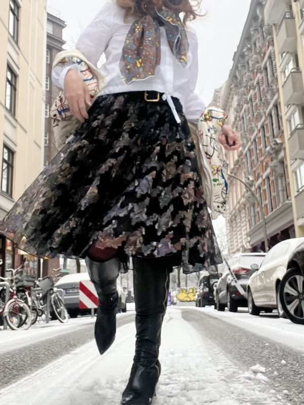Designer’s Comment: Dieser Rock ist fast ein One-and-Only. Fünf Stück wird es geben. Federleicht umspielt der bestickte und bedruckte Tüll die Beine. Ein Hingucker für elegante Abende oder lässig durch den Tag. Auch mit Oversized Pullover kombinierbar.