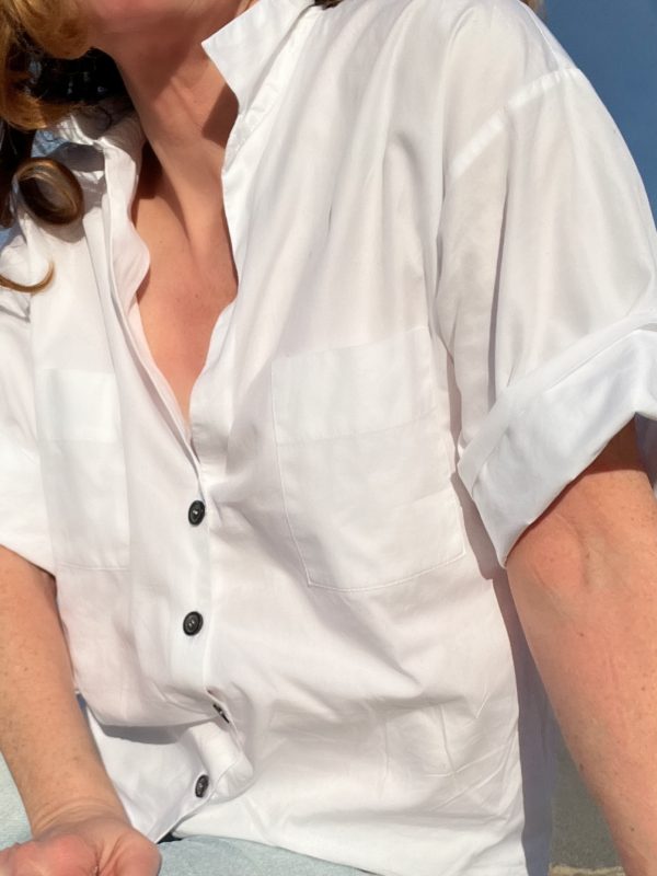 Wir nennen sie “Kimono Bluse” aufgrund der ungewöhnlichen im rechten Winkel eingesetzten Ärmel, welche sich nach unten hin kaum verjüngen und lässig gekrempelt werden können. Der tiefe Ausschnitt, der kleine Kragen und zwei Taschen links und rechts über der Brust sowie die dunklen Hornknöpfe schaffen einen lässigen und dennoch klassischen Look. Die perfekte Bluse für den Frühlingsanfang.