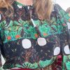 Diese Bluse ist ein Modell, das sich über viele Saisonen zu einem Must-Have entwickelt hat. Sie basiert auf einem Entwurf von Yves Saint Laurent aus den 1970er Jahren: kleiner Rundhals mit Knopf, weiter Puffarm, hochgeschoppt oder nach unten gezogen, schmal und kurz im Rumpf. Wir haben sie nun aus dem Crêpe de Chine Seidenstoff mit dem Motiv Kindermond genäht. Leicht fällt sie, und das von einem kleinen Jungen gemalte Bild mit den weißen Monden spielt fröhlich mit den weich fallenden Falten.