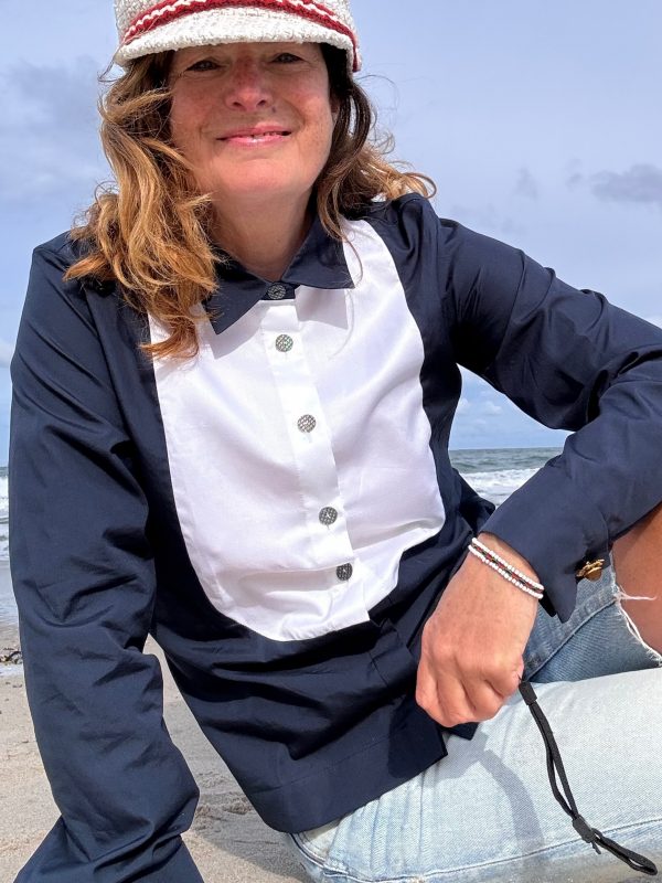 Die Smoking Bluse aus wunderbarem 100% Cotton in navy blue mit Piqué-Einsatz besitzt einen strengen Look, abgemildert durch die sanfte weibliche Taillierung. Schon Yves Saint Laurent erfand den Smoking und das Smoking-Hemd für die Damen. Kleiner Kragen. Die Knöpfe sind aus Muschel gelasert. Die Manschetten sind überschlagen mit einem Schlitz für Manschettenknöpfe, was die Bluse noch edler macht. (Auf Wunsch auch mit normaler Manschette und Knopf – einfach in der Bestellung notieren.)