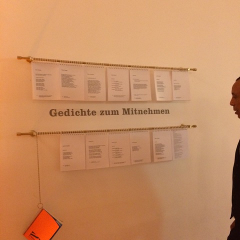 Hier stehen Peter Prange und ich am Bistrotisch im Raucherzelt. Da Peter ein wunderbarer Geschichtenerzähler ist, vergeht die Zeit im Flug. O Gott, schon wieder halb zwei – auf dem Weg zu meiner Unterkunft nehme ich mir noch schnell eins von den Gedichten mit, die der Verlag an die Wand gehängt hat.