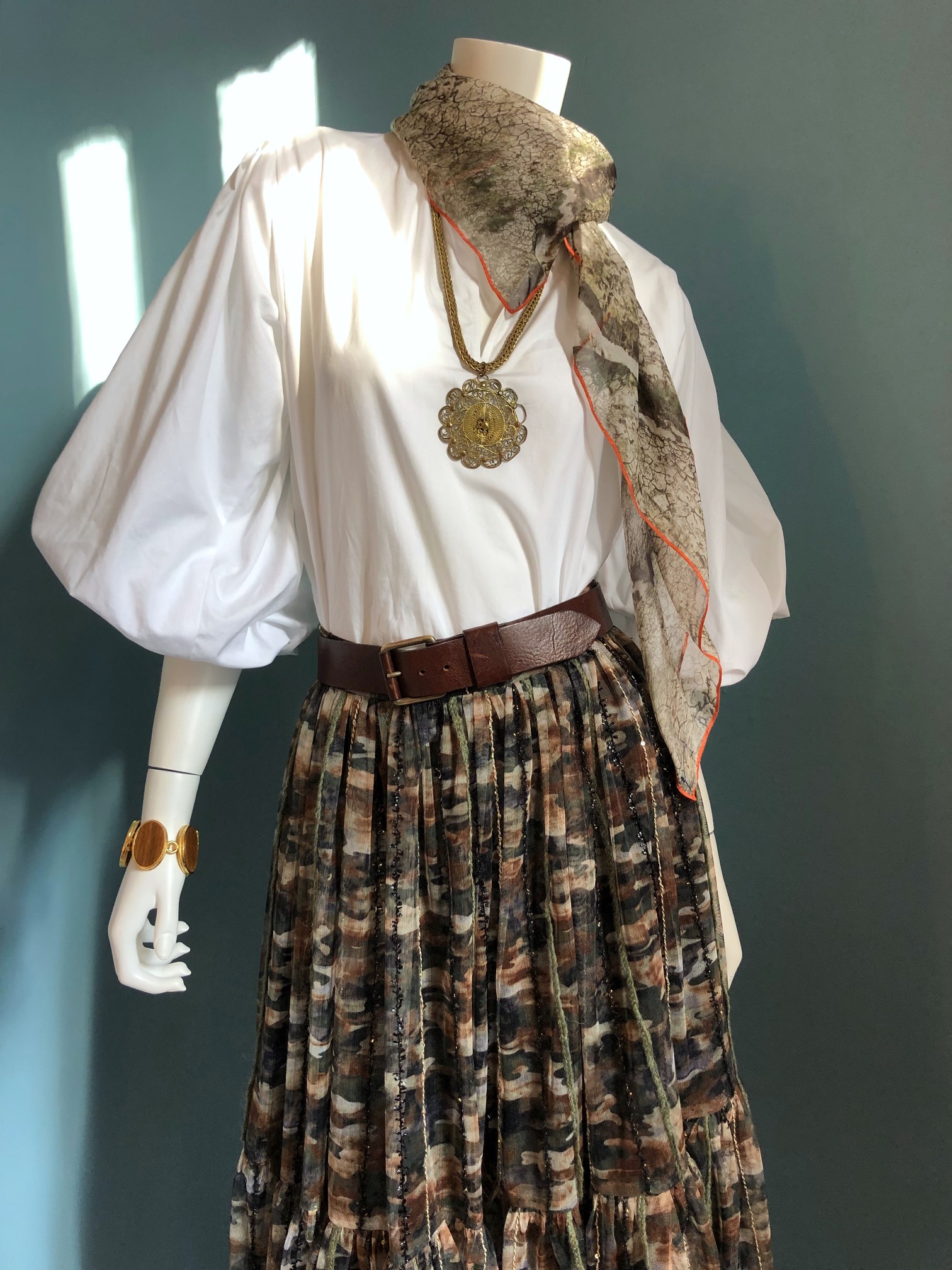 Den Camouflage Tütü gibt es in wenigen Stückzahlen. Gestern habe Carmen und ich ihn für den neuen Online Shop fotografiert. BlogleserInnen können ihn schon jetzt erwerben (€ 898). Hier kombiniert mit Holland Bluse (€ 398), Savannen Seidenschal (€ 198) und historischer Kette aus Nigeria (€ 550), Vintage Ledergürtel (€ 189). Total Look für Euch zum Sonderpreis von € 1990.