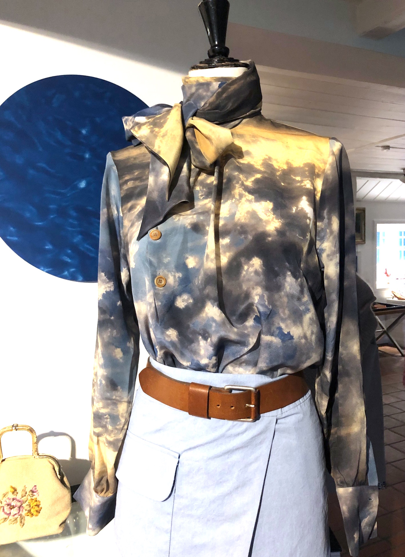 Abb: Shirt “Grenzenlos Denken” (€ 89), Skirt schwarz (€ 498), Waterscape Tuch (€ 198). Total Look = € 690.