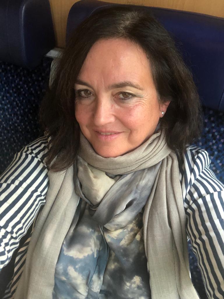 Nicole, Freundin, Blogleserin, Architektin und Bahnreisende schickte soeben ihren Gruß: “Heute Venedig – Frankfurt. Dresscode ganz ‘vorschriftsmäßig’ die Reisebluse …” – Die Wolken-Edition ist vergriffen, aber es gibt einen neuen Prototyp in S/M mit Schleife, den eine (!) Glückliche ganz schnell kaufen kann (€ 300 Musterpreis). Dazu den Stretch-Blazer in Streifen (€ 398).