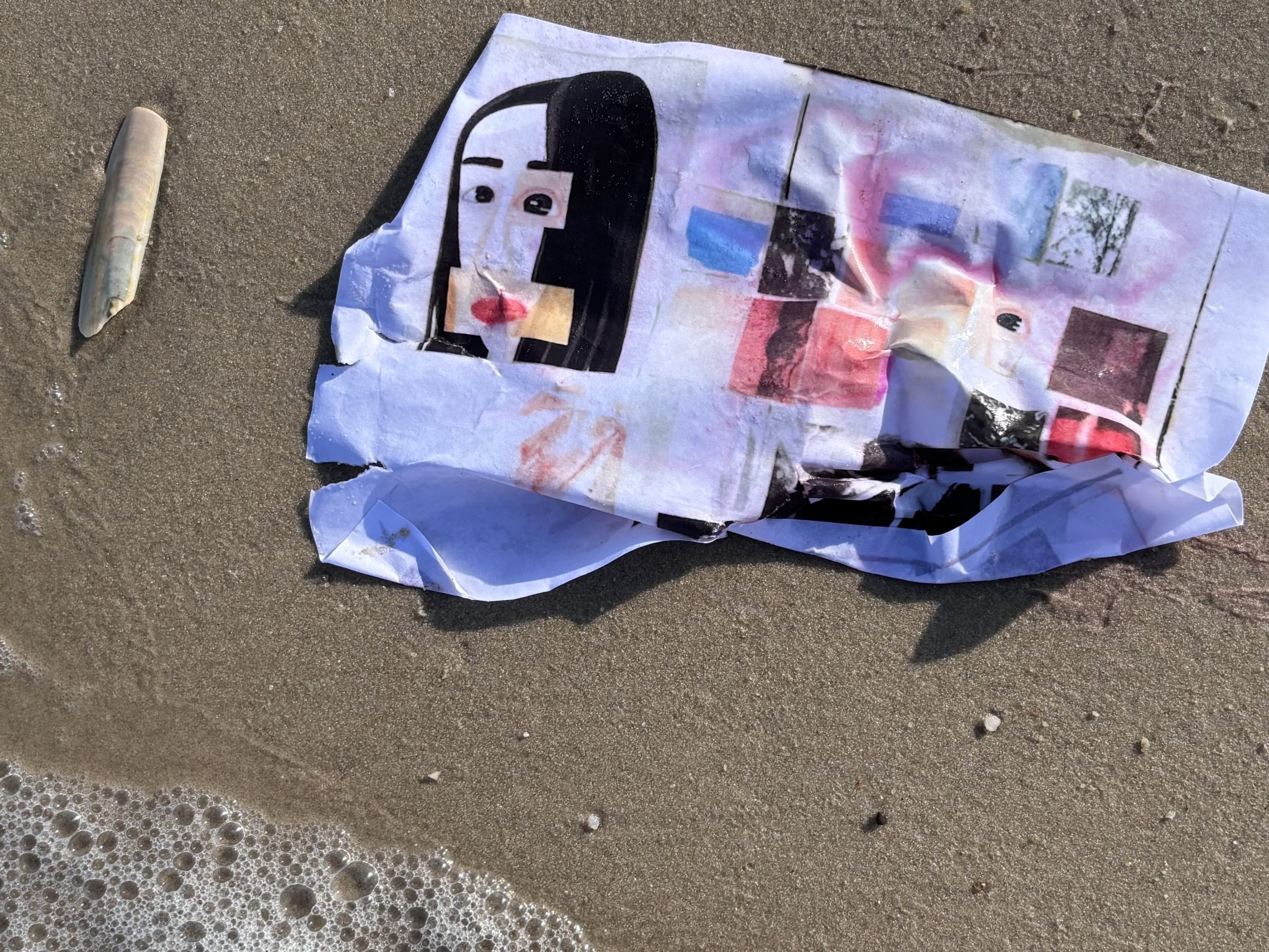 Die Brille inspiriert mich genauso wie das Skizzenbuch der Abschluss-Studentin der Royal Academy of Fine Arts Antwerp. Die Kopie daraus lasse ich in den Wellen schwimmen bis das Papier sich in Fetzen auflöst. Jedes Stück scheint eine kleine Geschichte fortzuführen.