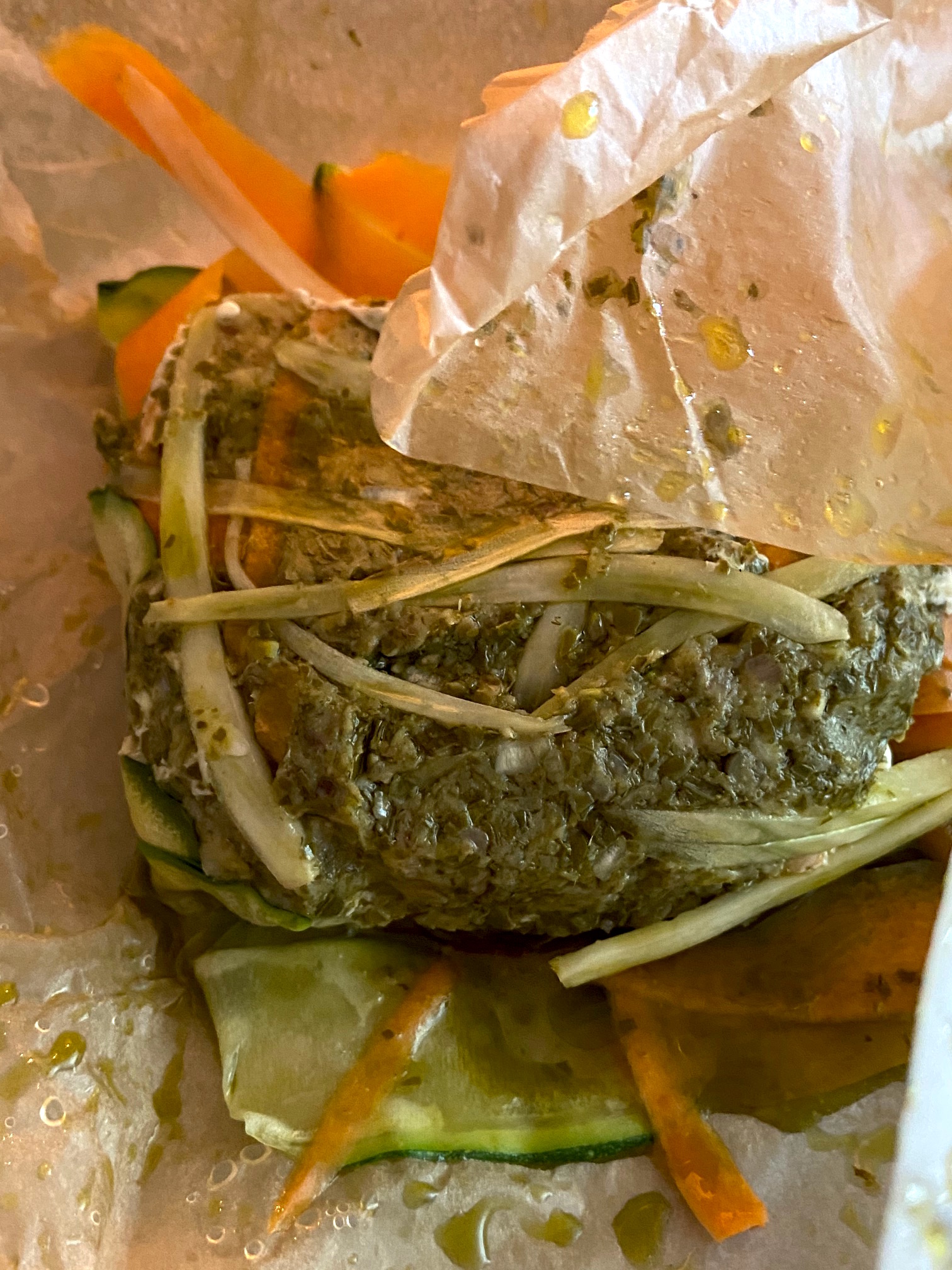 Das war’s beinahe schon, lediglich sorgfältig verpacken, knoten, verschnüren, tackern, zusammen nähen …. Ihr könnt so etwas gewiss besser als ich, wichtig: Das Lachs-Gemüse Paket muss gut verschlossen sein, damit keine Flüssigkeit ausläuft.