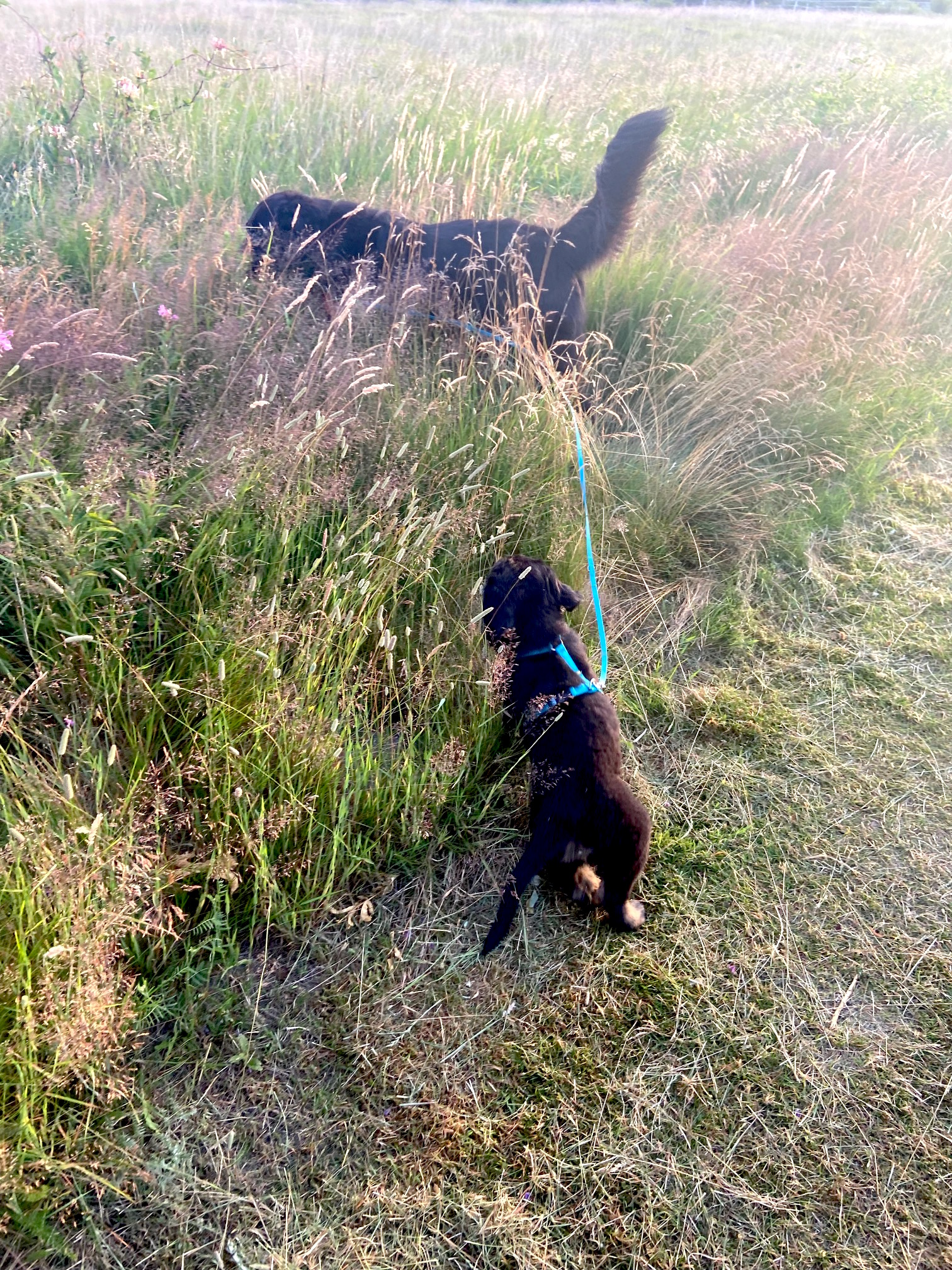 Die erste Nacht verlief ruhig, keine Tränen, kein Gejaule, der Senior zeigt dem Baby, wie die Dinge laufen. Heute morgen ging es mit Sonnenaufgang zum ersten kleinen Spaziergang in die Braderuper Heide.