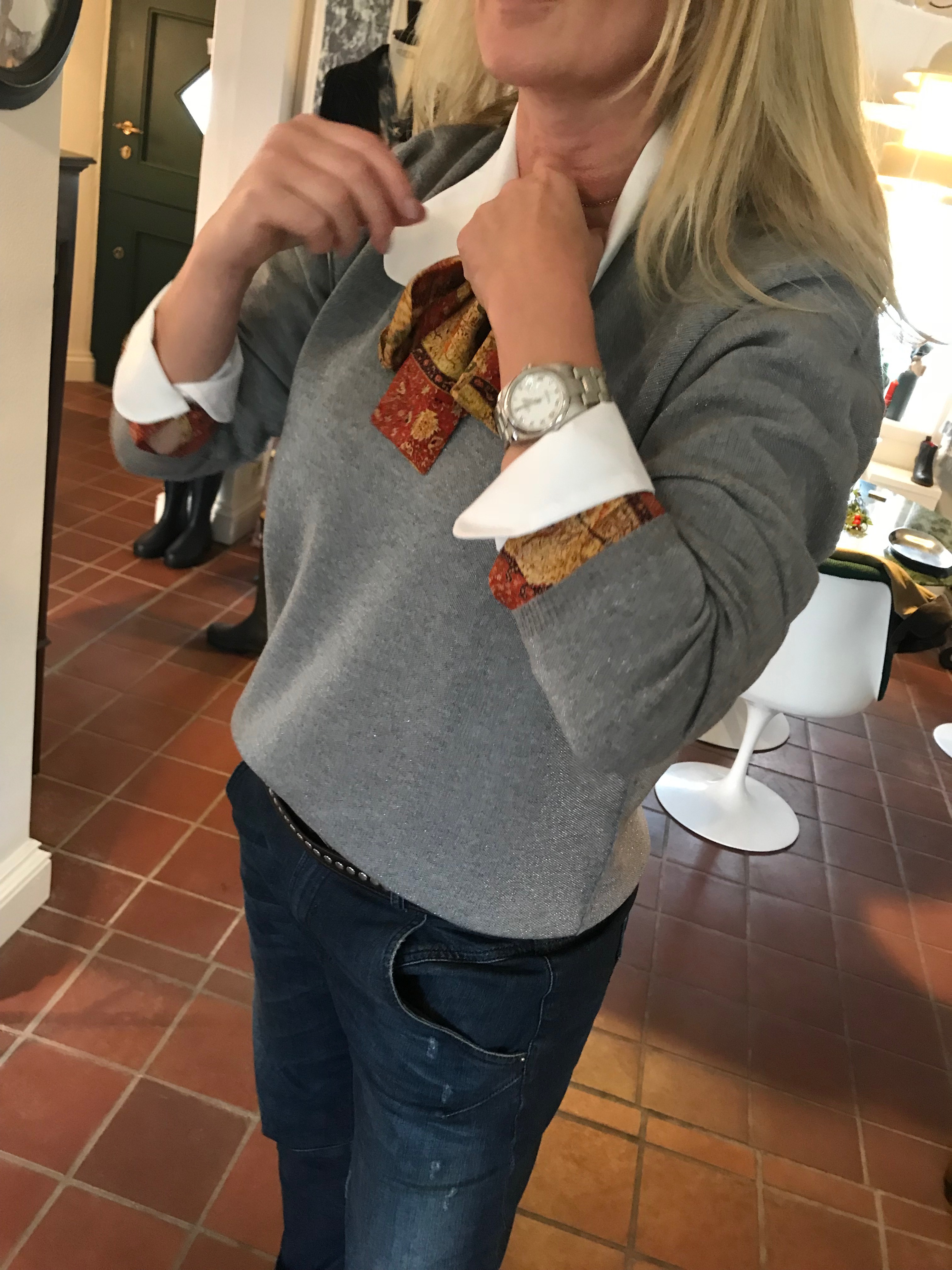 Abb. Day-and-Night Pullover grau/silber, ab nächster Woche online. Jetzt in Hamburg und in Kampen. € 398. Blouse Arabeke mit weißem Kragen, € 398 in Hamburg und Kampen. Nächste Woche online. Mein Lieblingsoutfit im Moment!