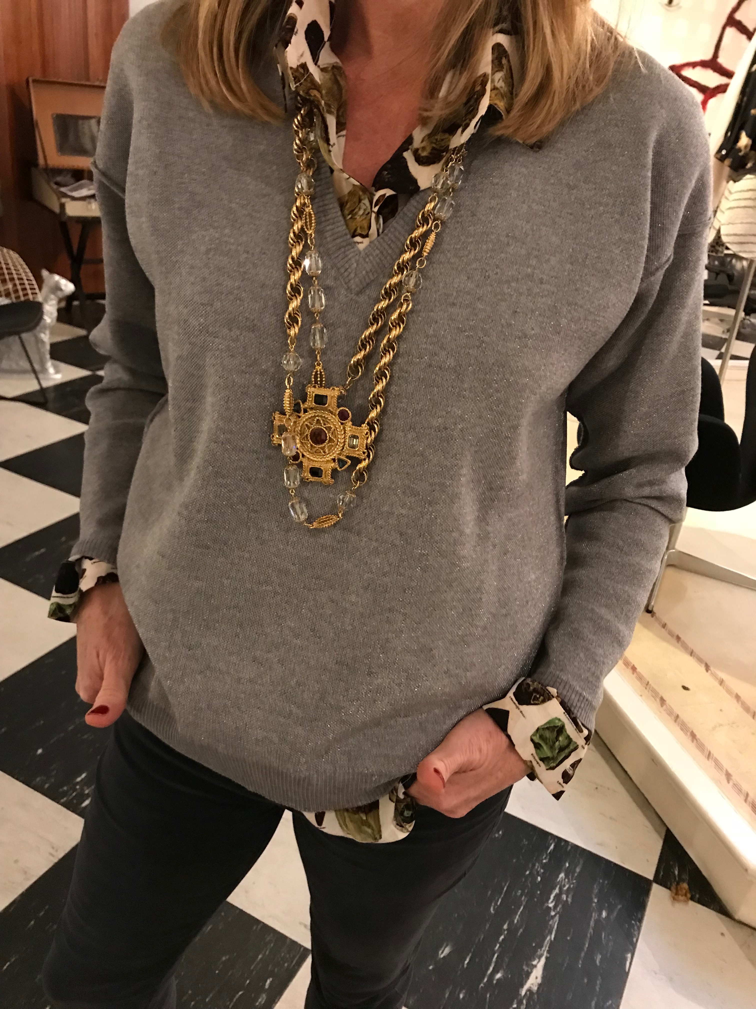 Abb: Day-and-Night Pullover, grau mit V-Ausschnitt, ab nächster Woche online. Jetzt schon mal reservieren: € 398. Diamond Bluse (reduziert € 200, nur noch M). Kette YSL Vintage und Brosche Balenciage Vintage beides bei Roger Goossens (verkauft).