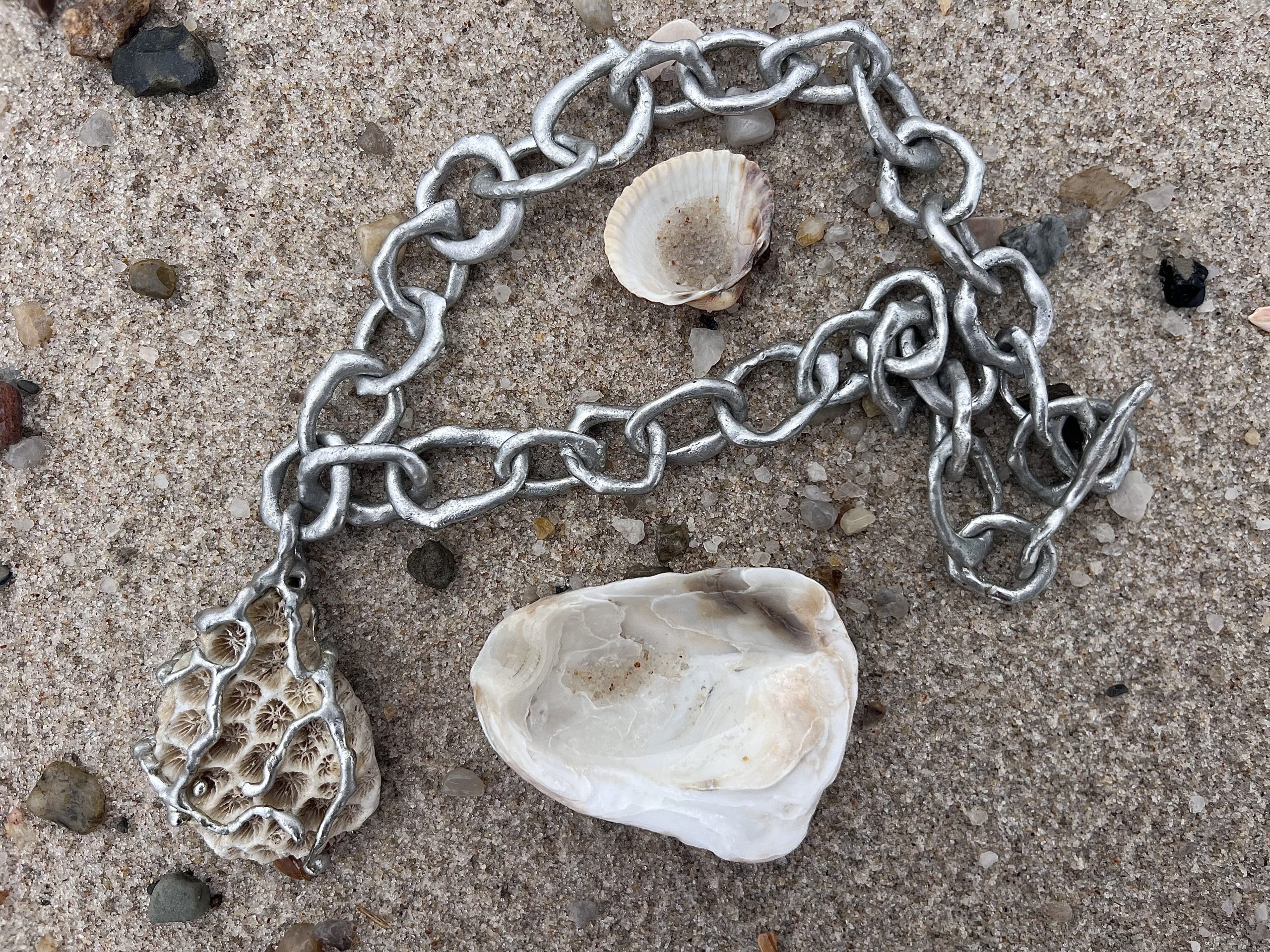 Floryne, Muschelkette mit Glas und Knochen, Zinn (€ 180)