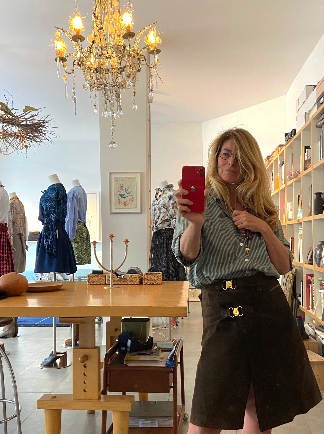 Abb: Vintage Celine Lederrock aus den 1970ern, Hemd Cristaseya, Ketten Yves Saint Laurent. Titelfoto: Tasche Roberta di Camerino, 1960er (€ 1.200)