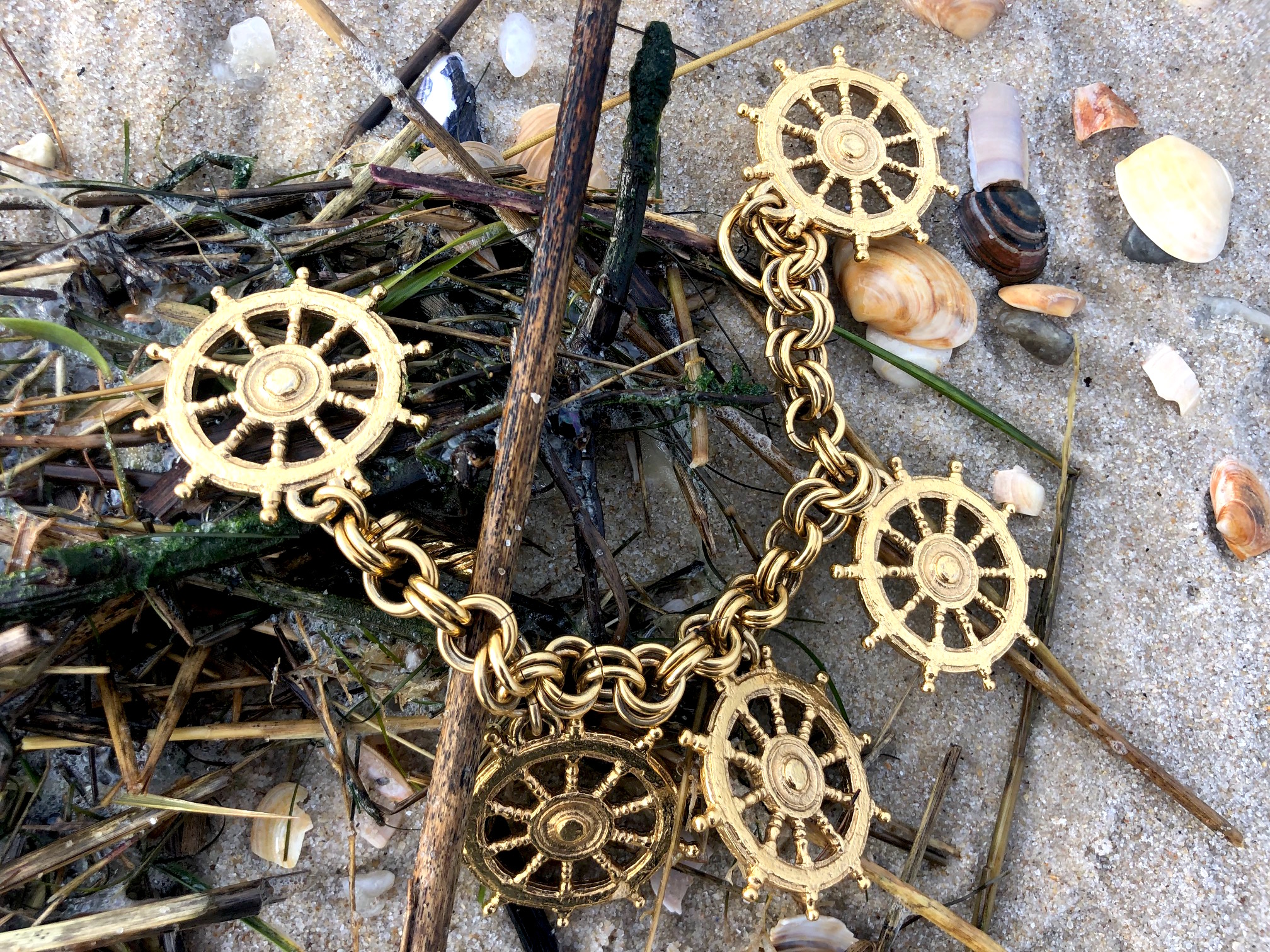Und am Ende, na klar, mussten es noch die Schiffsruder sein, die an der mehrgliedrigen Kette hängen. Es ist ein Armband für eine große selbstbewusste Frau, die es versteht, dominanten Schmuck zu tragen. Wunderschön, wie es dann mit jeder Bewegung am Handgelenk klimpert, ein inspirierender Dialog zwischen Mode-Schmuck und der Trägerin, die mit dem ihr eigenen Bewusstsein durch den Alltag schreitet.