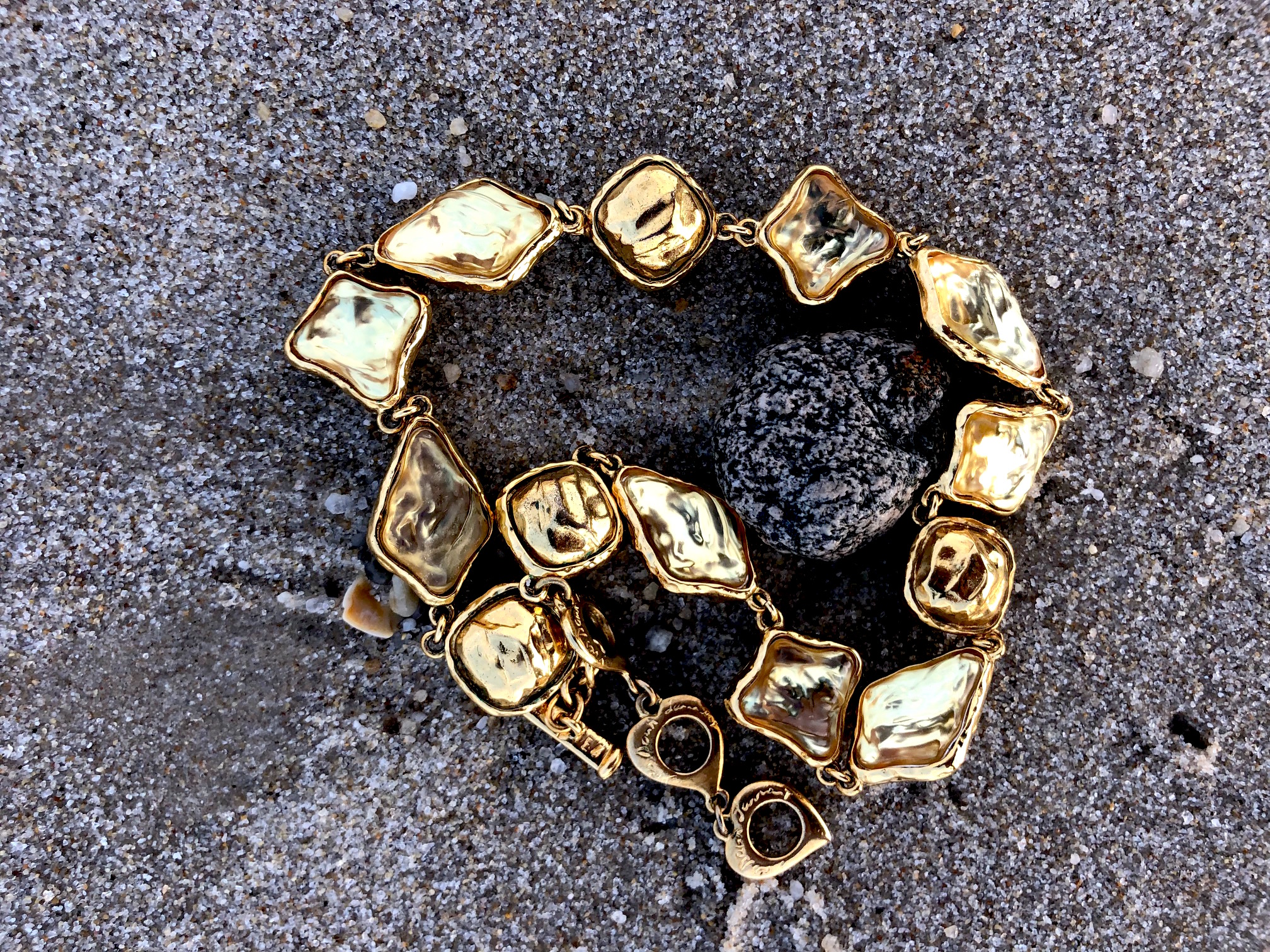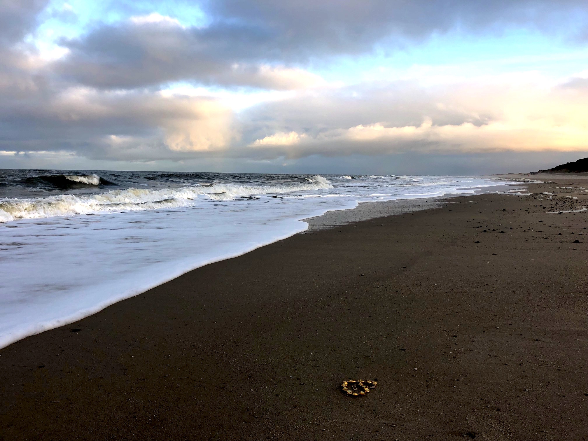 Im meinem Handy gibt es 48.543 Fotos, davon sind bestimmt mehr als 20.000 mit Himmel, Meer, Strand und Vögel. Und auf manchen ist ein Vintage Schmuckstück von Yves Saint Laurent zu sehen, wie zufällig aufgenommen in dem feuchten Sand, wie ein Strandgut zwischen Algen, Treibholz, Muscheln und Steinen.