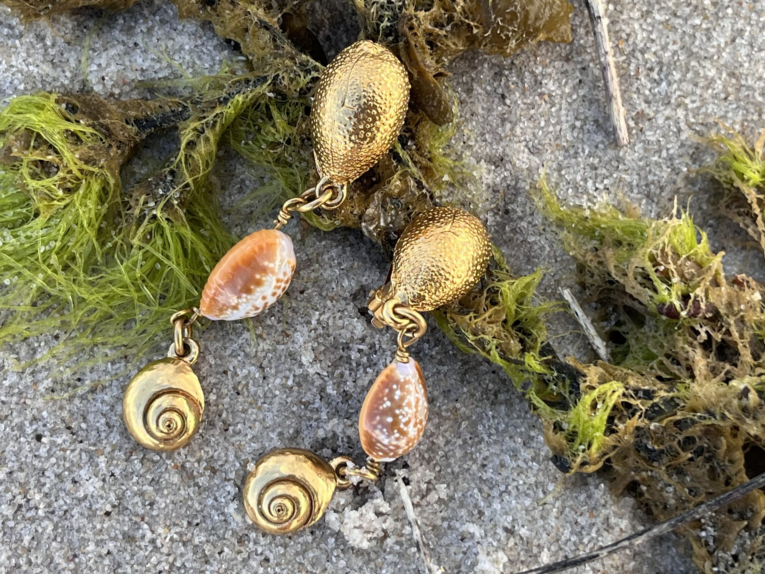 In der Tasche klimpern neben gesammelten Muscheln meine Pretiosen von Yves Saint Laurent: Die Ohrringe mit echten und vergoldeten Muscheln sowie das Armband mit dem glas-blauäugigen Seepferdchen. Sie gehören zur gleichen Serie.