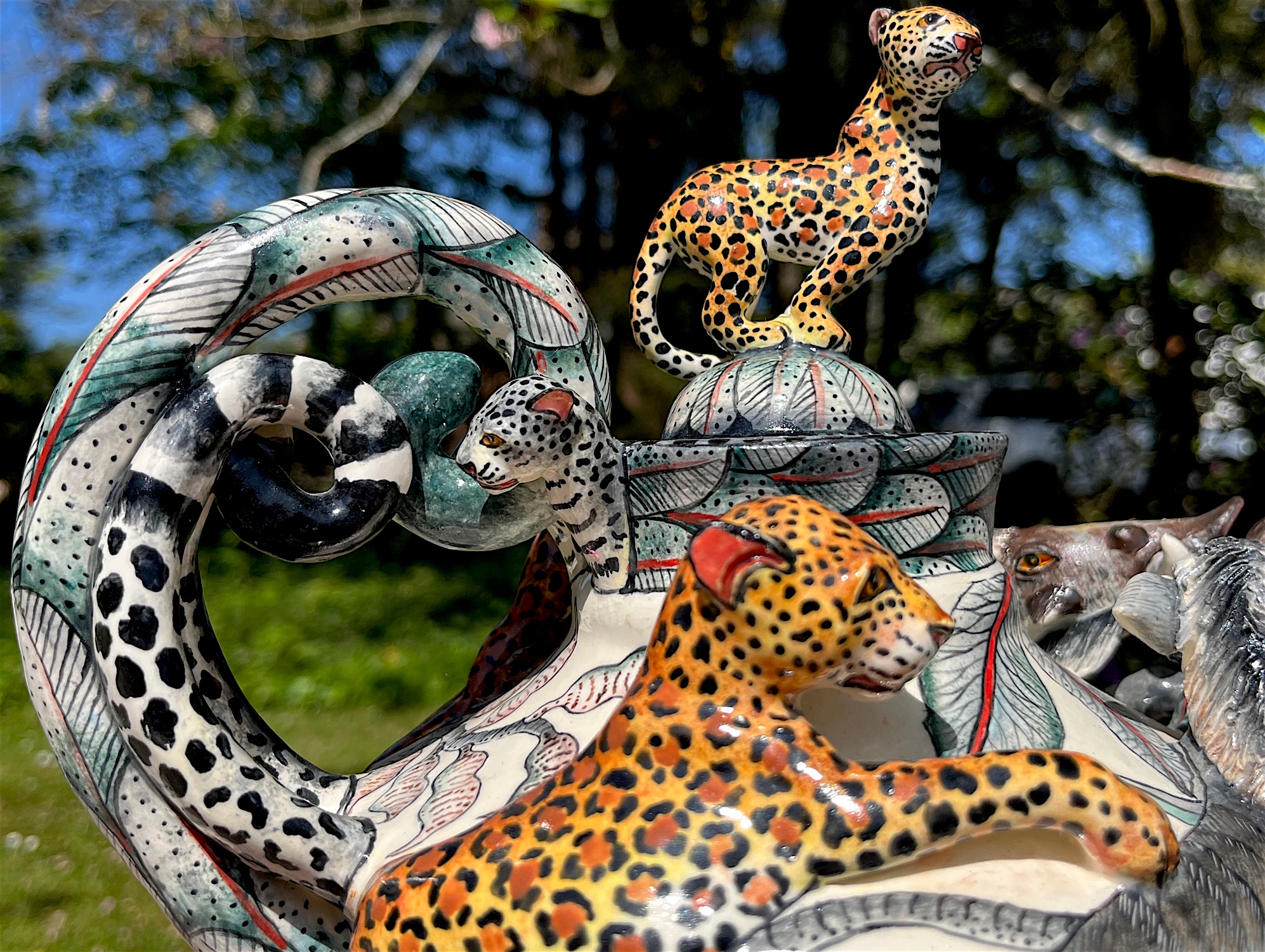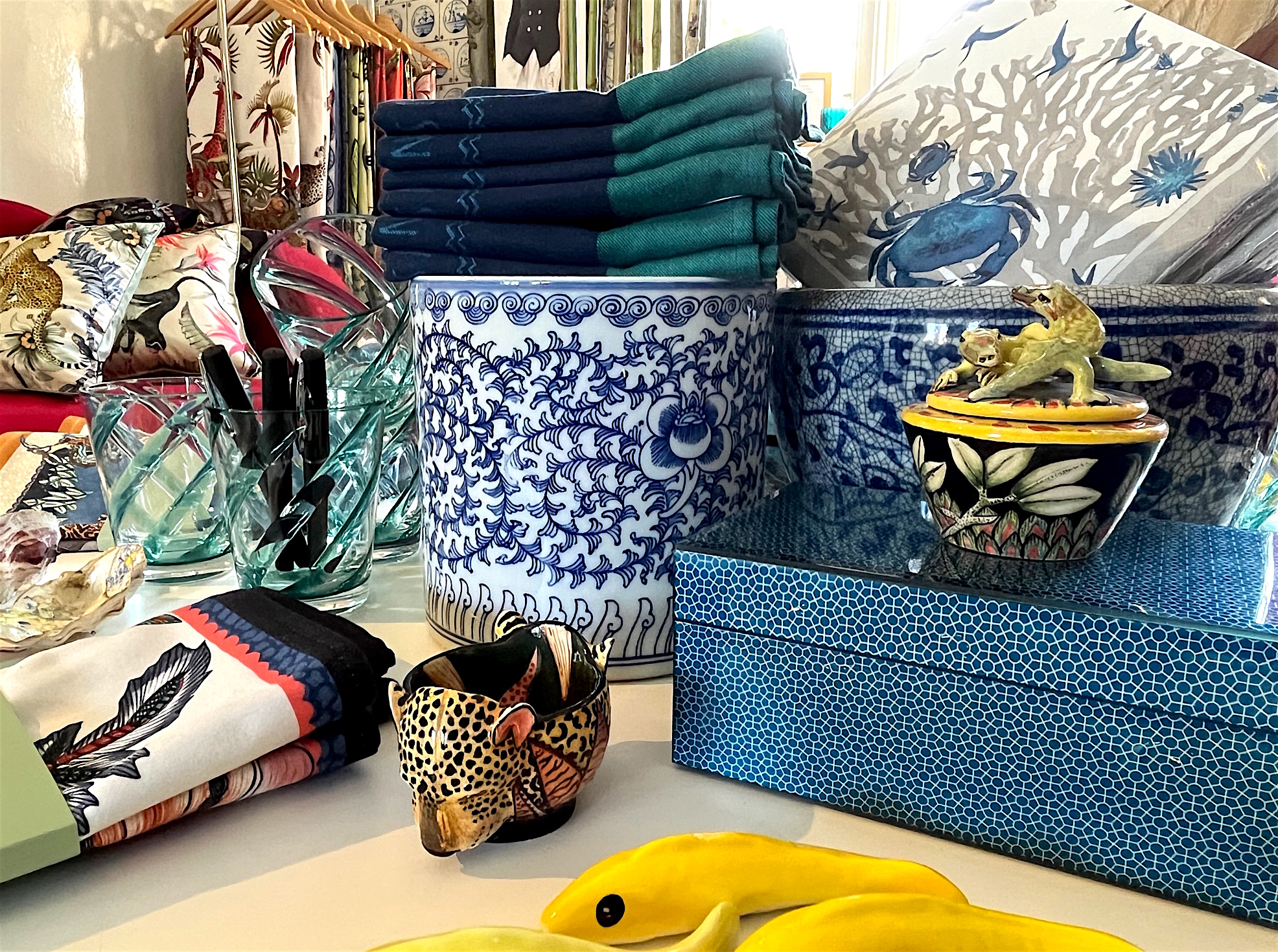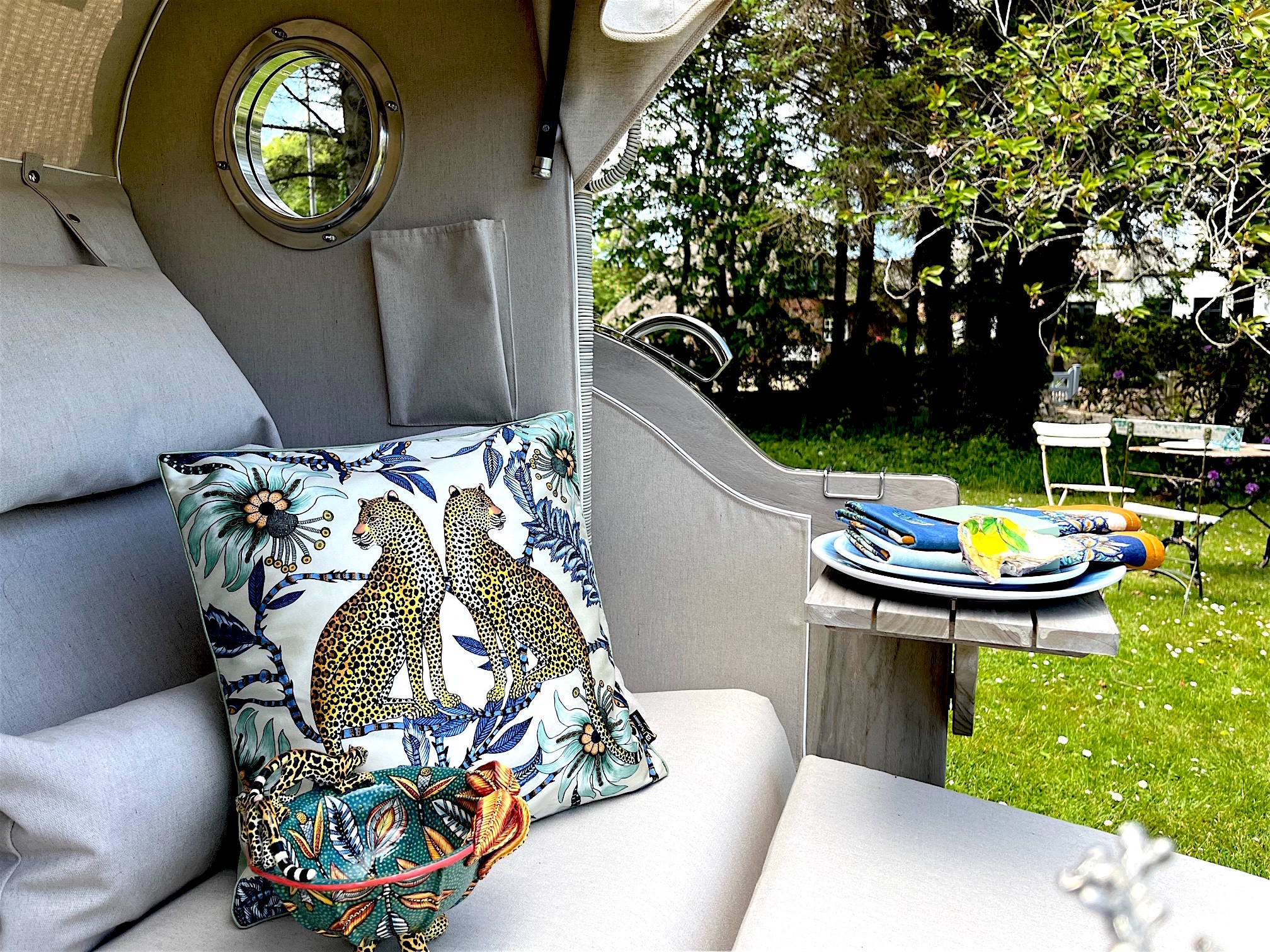 Unser neuer Strandkorb liefert die gediegen luxuriöse Kulisse für die Kissen von Ardmore, die Keramik-Unikat Schale mit den Leoparden sowie das Set von Tellern, Servietten und Muschen. Click, click, nicht nur ein Foto entsteht.