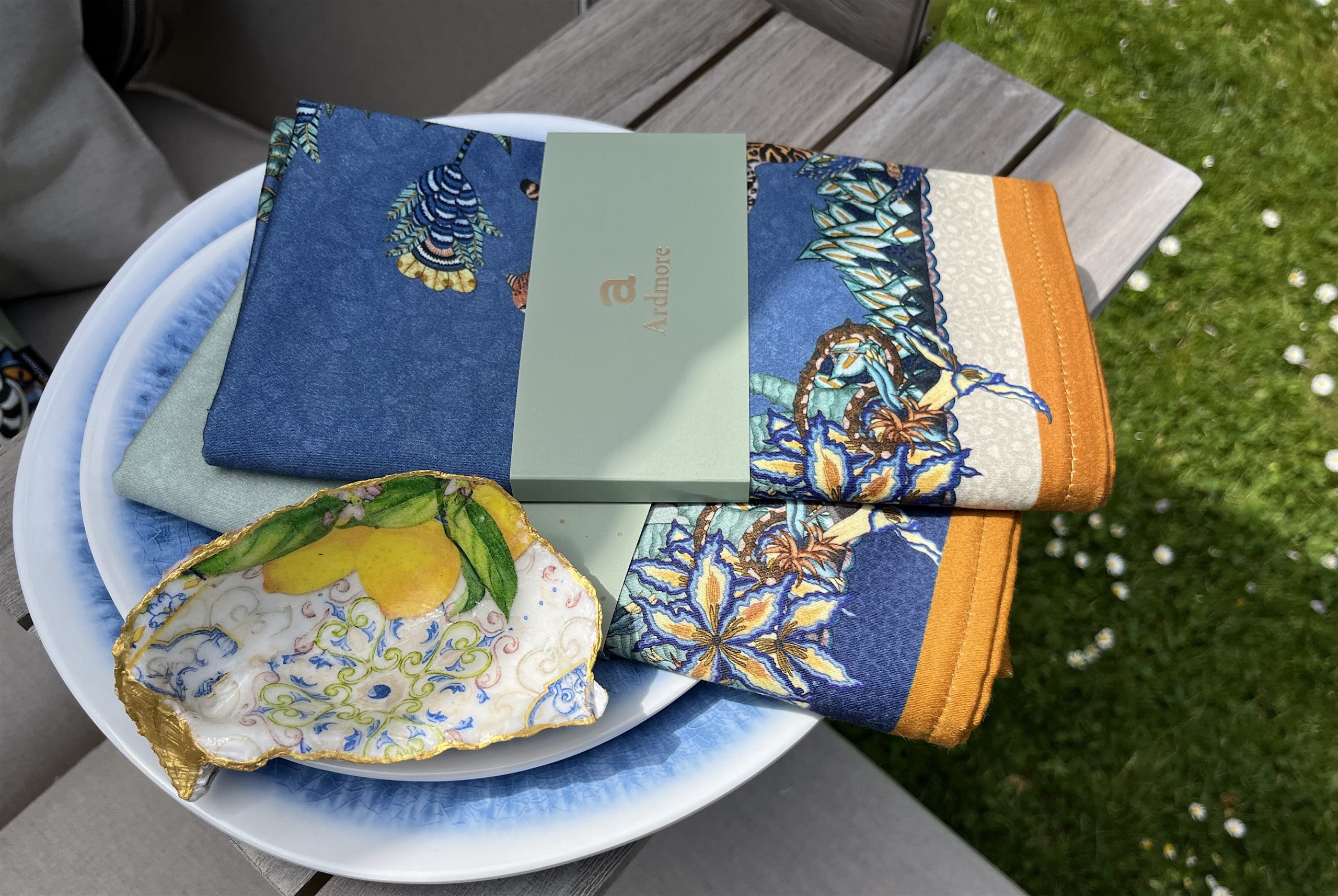 Ardmore Serviettenpaar, € 49, Muschel und Teller ebenfalls bei Roma e Toska Kamen und maison f. in Hamburg.