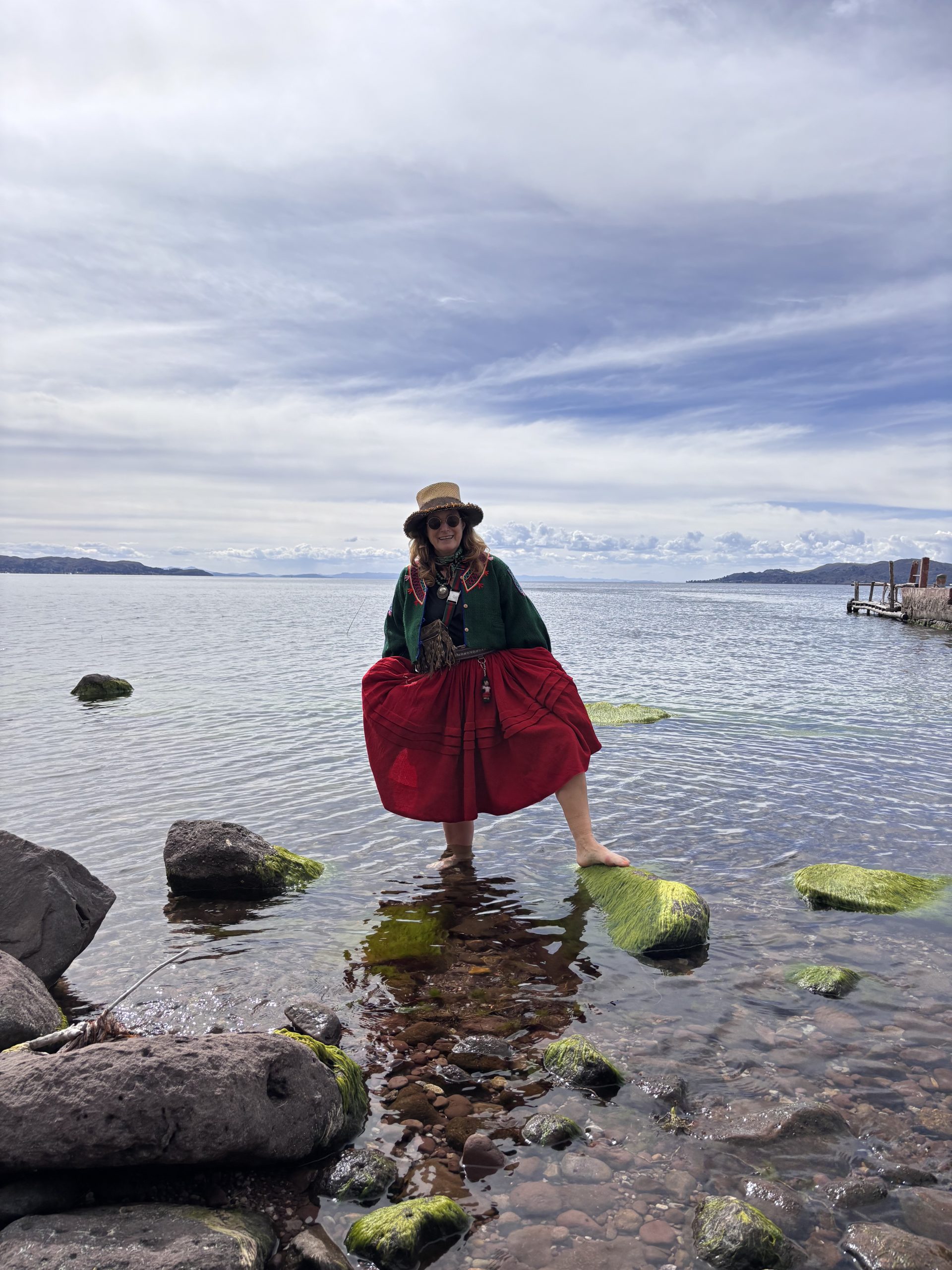 Gemeinsam sind wir schnaufend und hechelnd Schritt für Schritt und tranzend die eine Seite des Berges hoch und auf der anderen Seite wieder herunter, wo unser Boot auf uns wartet. Unvergesslich. Die Zeit reichte gerade noch für die Füße im kalten Wasser. Ich trage übrigens zu meiner Pollera einen von einem Mann gewebten Gürtel.
