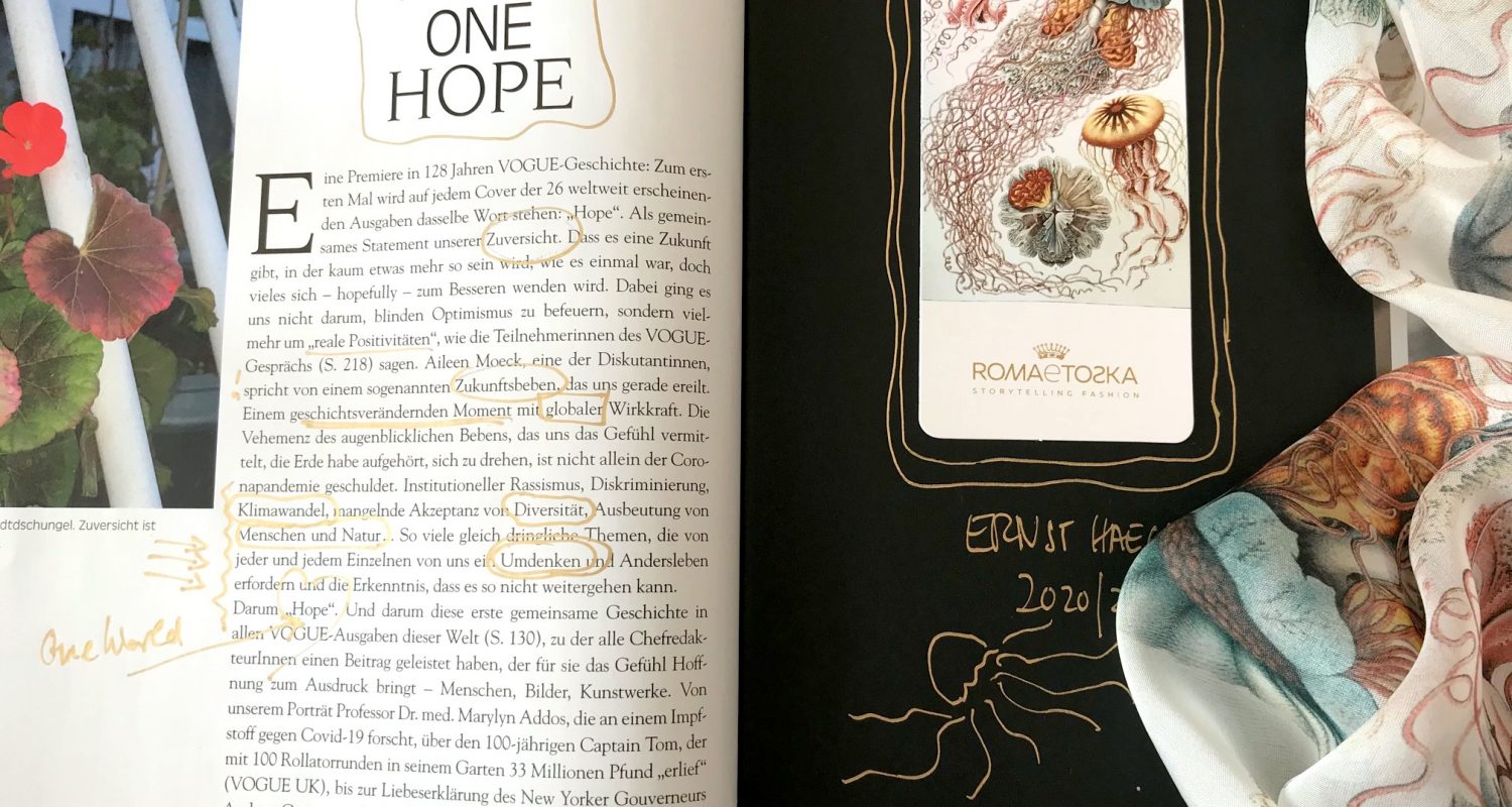 Gestern habe ich über das weltweite Experiment von Conté Nast geschrieben, alle 26 Länderausgaben der Vogue unter ein Thema zu bringen: HOPE. Heute habe ich dazu in der deutsche Vogue geblättert und liefere einen kleinen Nachschlag aus den verschiedenen Editorials, beginnend bei dem Vorwort von Christiane Arp (Vogue Deutschland). Es gefällt mir, was sie schreibt, …
