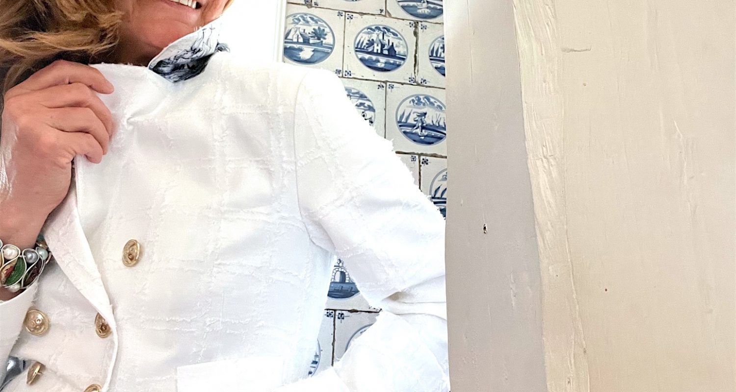 Man könnte ihn “Lieblingsstück” nennen oder “Must have” oder einfach ein Teil, das in der Roma e Toska Sammlung nicht fehlen sollte: Der weiße Doppelreiher Blazer mit den gold-silbernen Knöpfen und dem Delfter Fliesen-Muster aus unserem Kapitänshaus. Die Wandtäfelung ist original von 1689. Ergänzt habe ich den Stoffentwurf durch Walfänger-Motive aus dem Friesenmuseum in Keitum …