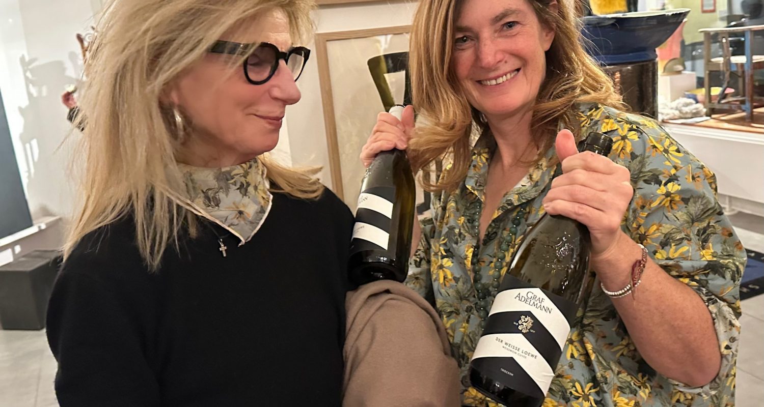 Neben mir steht Christine Gräfin Adelmann. Als junge Frau heiratete sie in das gleichnamige Traditionsweingut hinein, das bis in das Jahr 1297 zurückführt. Nun ist es ihr Sohn Felix, der die Geschäfte führt inkl. Burg und Parkanlage. Wir trinken zwei von ihr und ihm ausgewählte Weine, eine Weisswein Cuvée (Der Weiße Löwe), die köstlich schmeckt, …