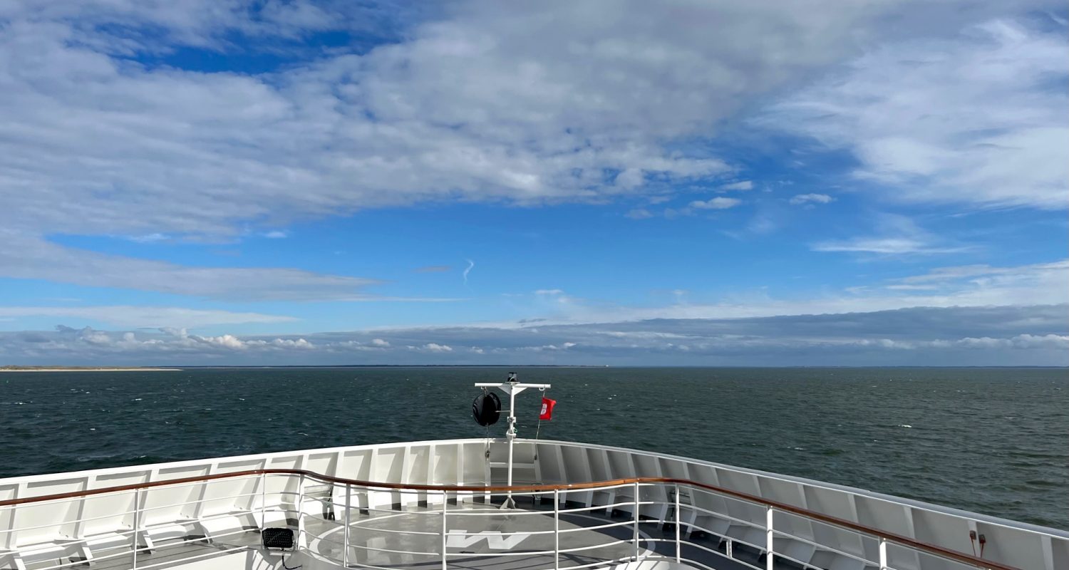 … oder, wenn Natur zum “Vor”-Bild wird, gemeint ist in diesem Fall die Hanseatic inspiration, eines der drei Expeditionsschiffe von Hapag-Lloyd Cruises, das gestern vor List/Sylt auf Reede lag und uns kleine Gruppe von Roma e Toska Freunden zum Champagner Empfang an Bord lud. Mitte: Astrid Reifferscheidt (HLC), rechts: Biggi Voss, beide mit Fellwesten und …