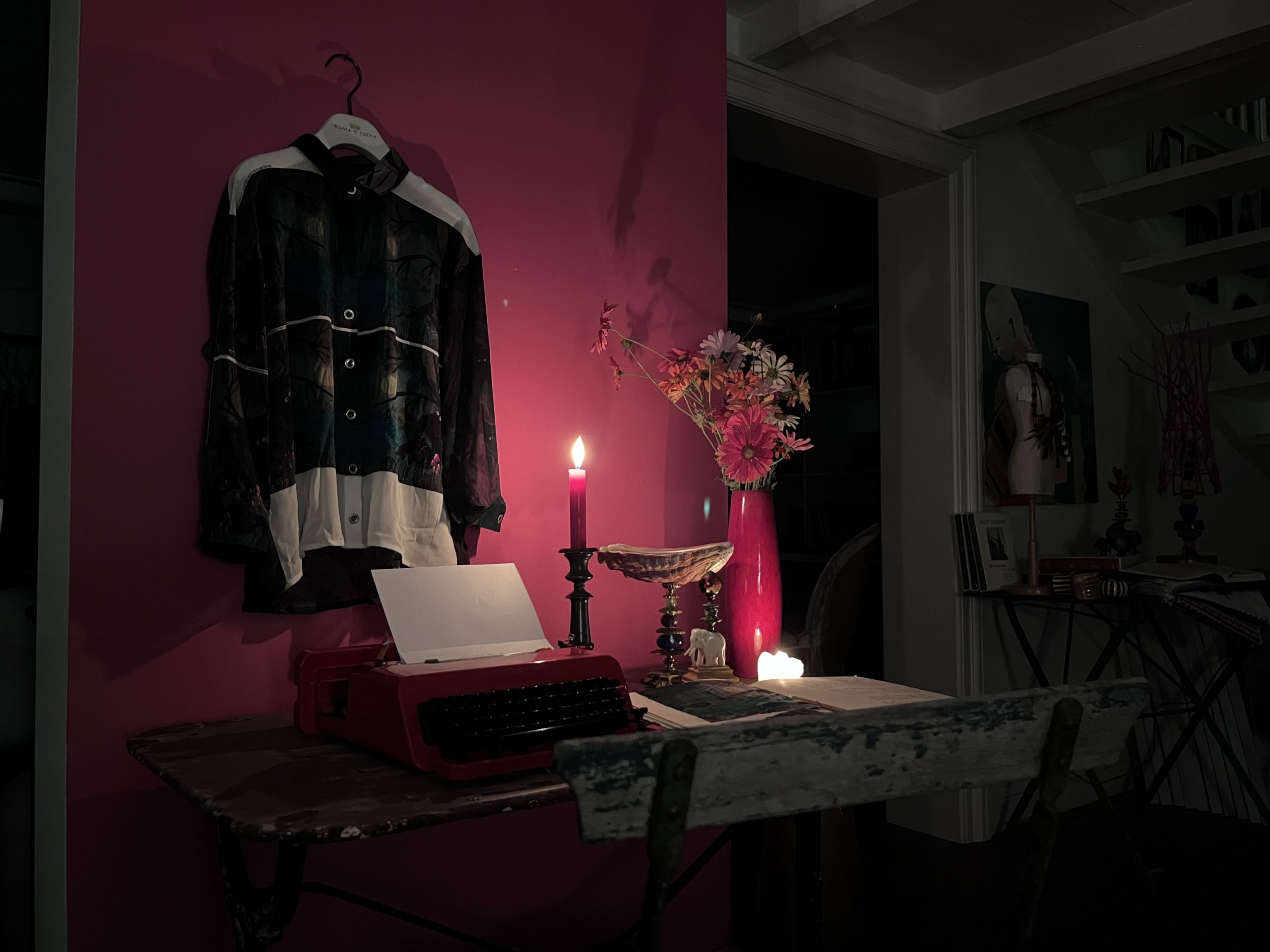 In die Wand schlage ich einen Nagel für den Bügel mit der “Childhood” Bluse. Davor der alte Tisch mit der Olivetti Valentine, zwei Kerzen, die Muschelschale von Klaus Dupont, ein Kunstblumenstrauß, mein Skizzen-Tagebuch. Ich installiere mich mit Wolldecke auf dem wackeligen Bistrostuhl aus Frankreich in meiner morgendlichen Schreibkluft. So beginnt die Szene. Klack-klack. Klack-klack. Überlaut …