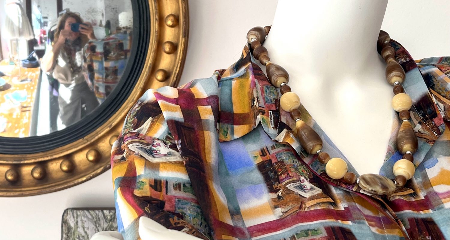Die Zeit drängt, und es gilt, den nächsten Vortrag für die MS EUROPA Reise fertig zu stellen: “Muster Mix”, lautet das Thema. Zusätzlich kann jeder an Bord seinen eigenen Seidenschal aus unseren Chiffon-Stoffen entwerfen, später realisiert im Atelier in Hamburg. Ihr seht, wir betreiben durchaus Aufwand, um unterhaltend zu sein … Aber erst einmal eintauchen wir ein in die Geschichte …