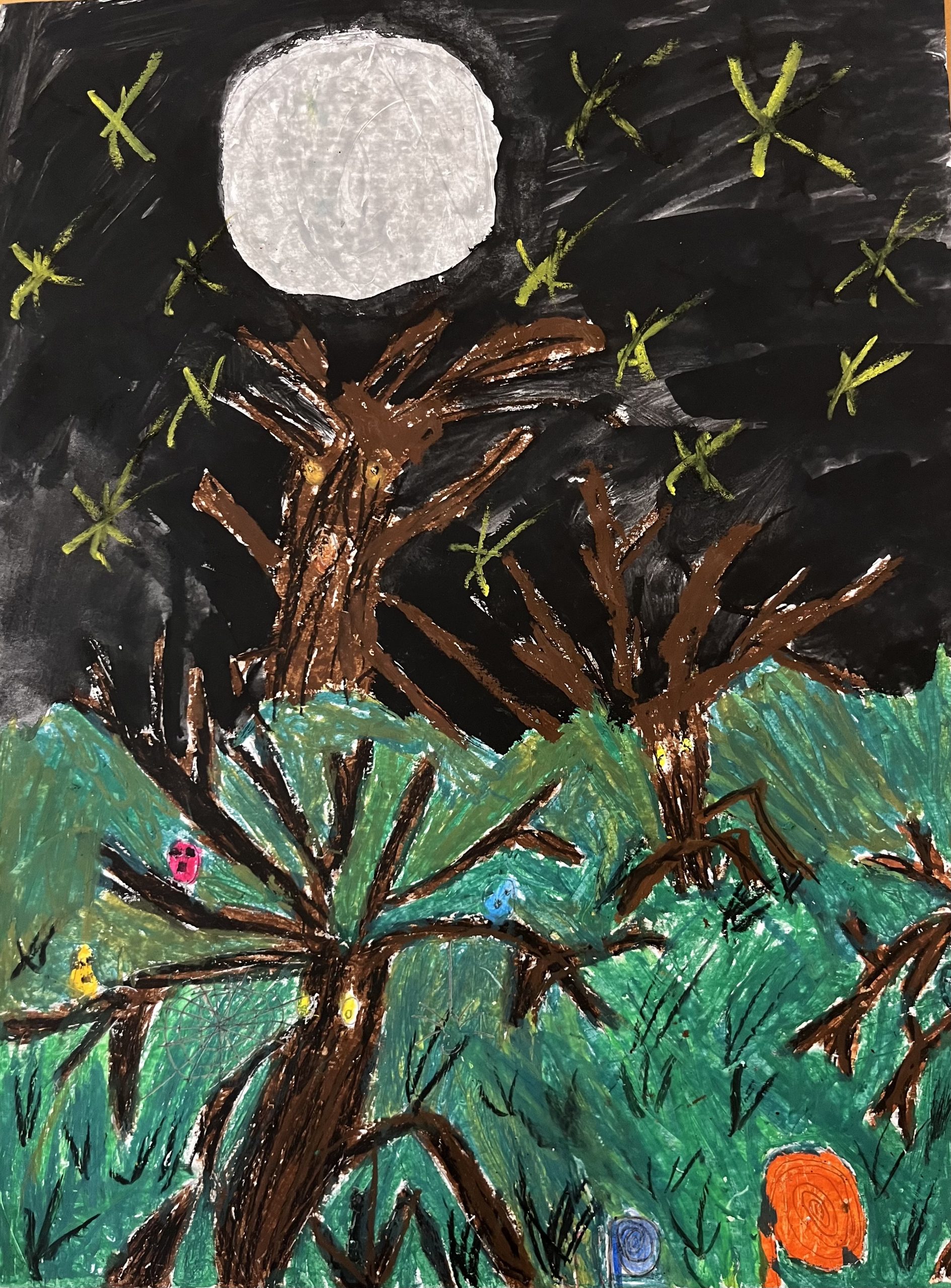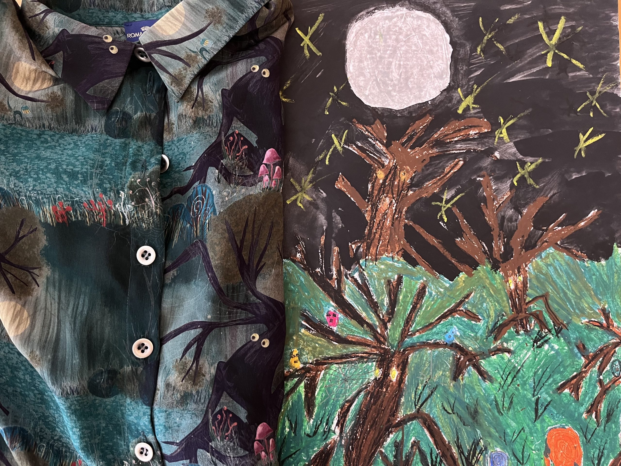 Dann schickte sie mir erste Fotos, und ich war absolut begeistert. “Ob wir daraus nicht Stoffe machen könnten”, fragte ich sie. So entstand die kleine Kooperation, die nun zum dritten Kapitel von CHILDHOOD führt. Es beginnt mit dem Bild “Wintermond”, wie ich es genannt habe. Bäume mit Augen, die weiße Mondkugel sowie die gelben Sterne auf schwarzem Himmel. Unten laufen orangefarbene Wesen entlang, und auf den Ästen sitzen kleine rot, gelb, blaue Monsterchen.