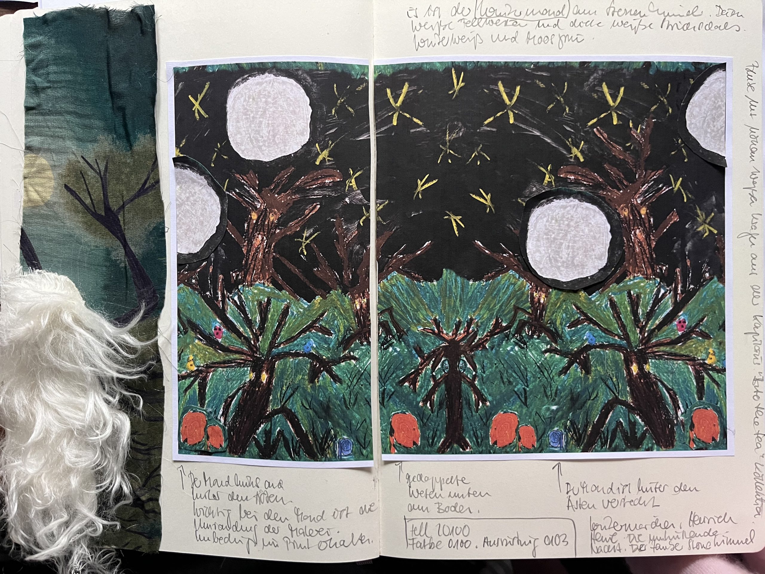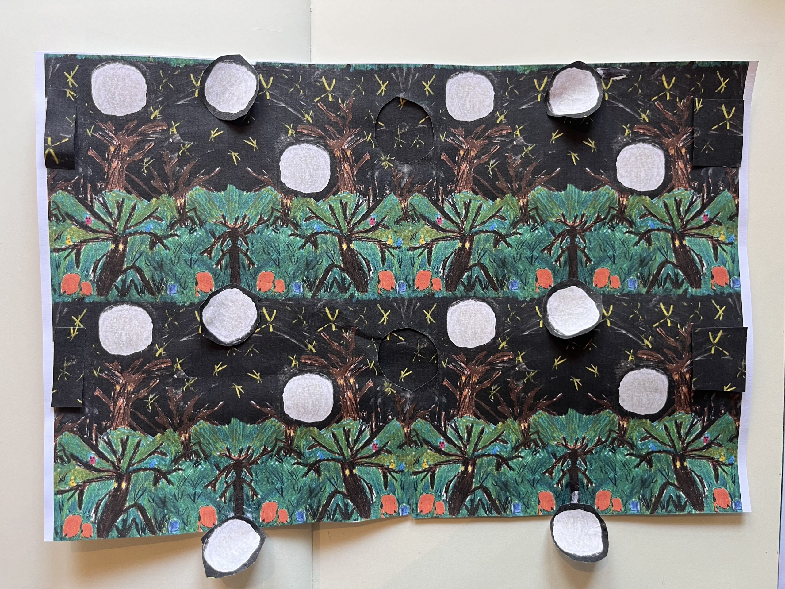 Meine Arbeit beginnt. Wie gewohnt, nehme ich meine Schere, um aus der Fotokopie einen Entwurf für den endlos Stoff-Rapport zu schneiden. Der Mond wird vervielfacht, wie ein Schneeball sieht er nun aus. Die Linien zwischen grünem Gras und dunklem Himmel werden durchlässig.